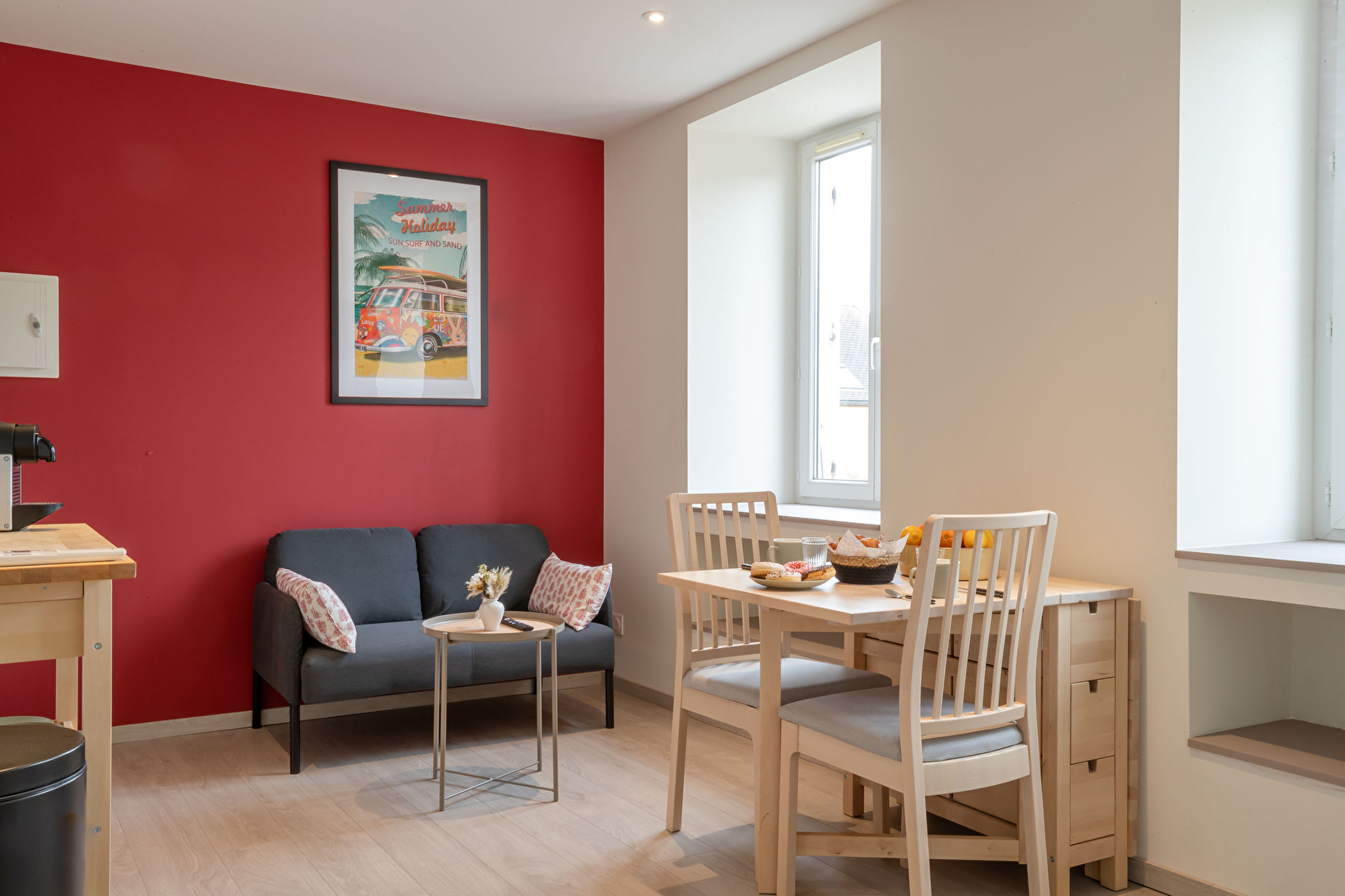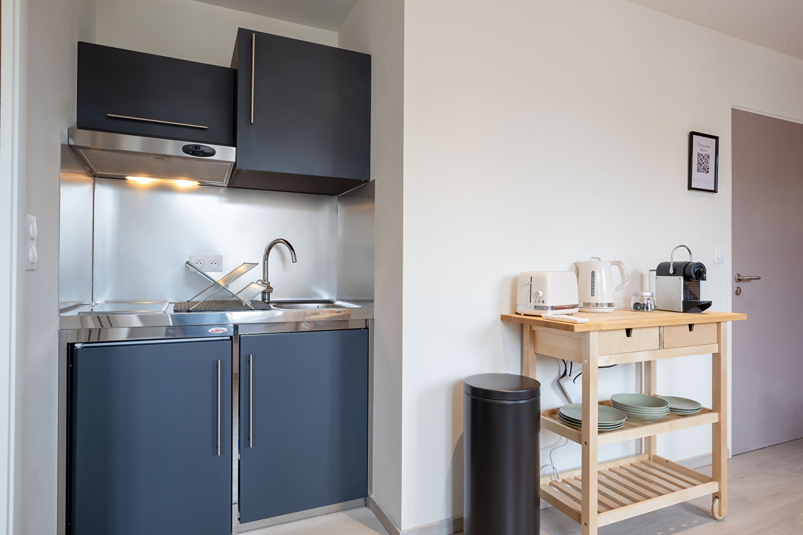 Entrée sur un petit salon meublé avec coin kitchenette équipé : 2 plaques induction, frigidaire, four traditionnel / micro-onde, bouilloire, grille-pain, machine à café Nespresso ainsi que tous les ustensiles nécessaires à la cuisine (Vaisselle, couverts).