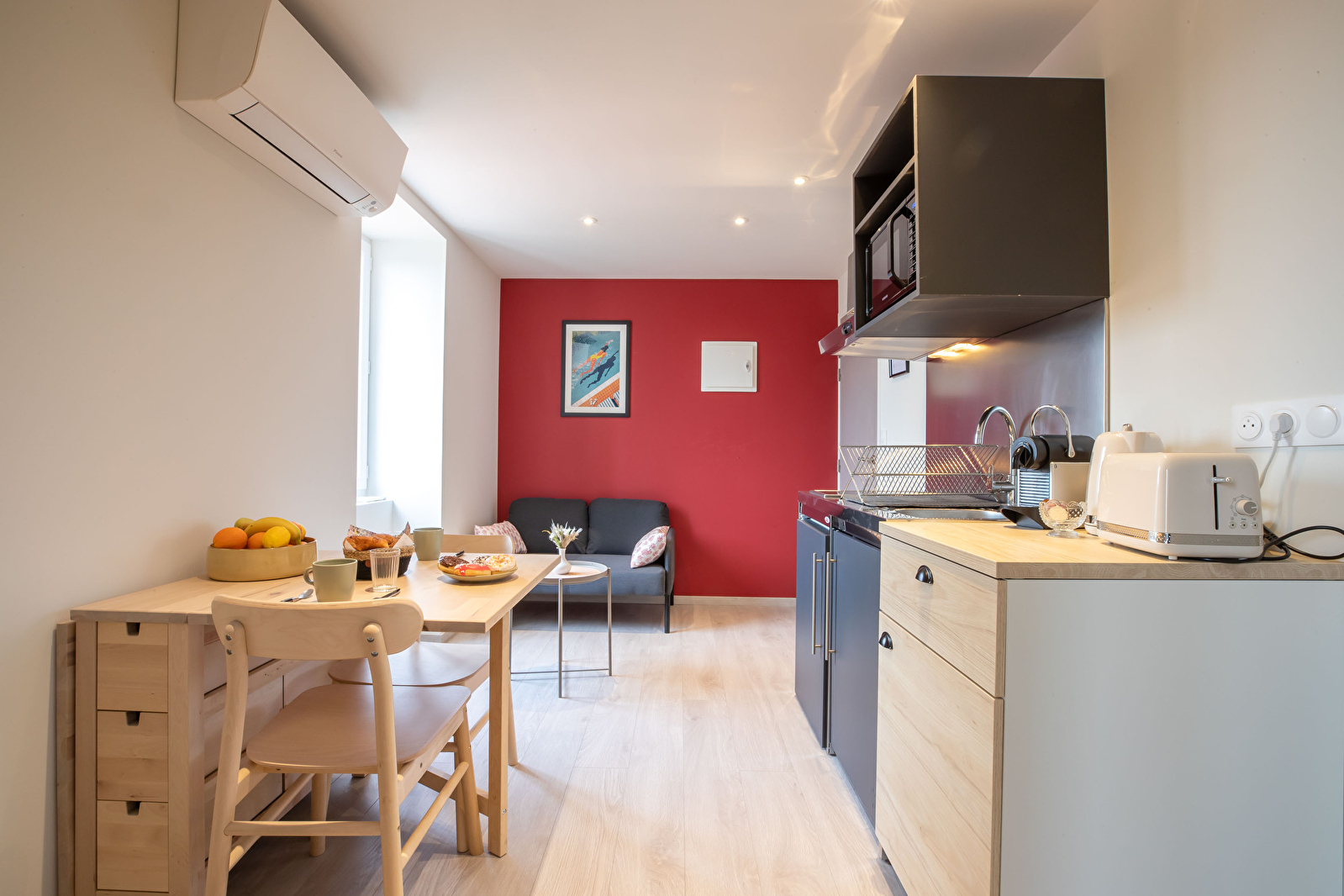Entrée sur un petit salon meublé avec coin kitchenette équipé : 2 plaques induction, frigidaire, four traditionnel / micro-onde, bouilloire, grille-pain, machine à café Nespresso ainsi que tous les ustensiles nécessaires à la cuisine (Vaisselle, couverts).