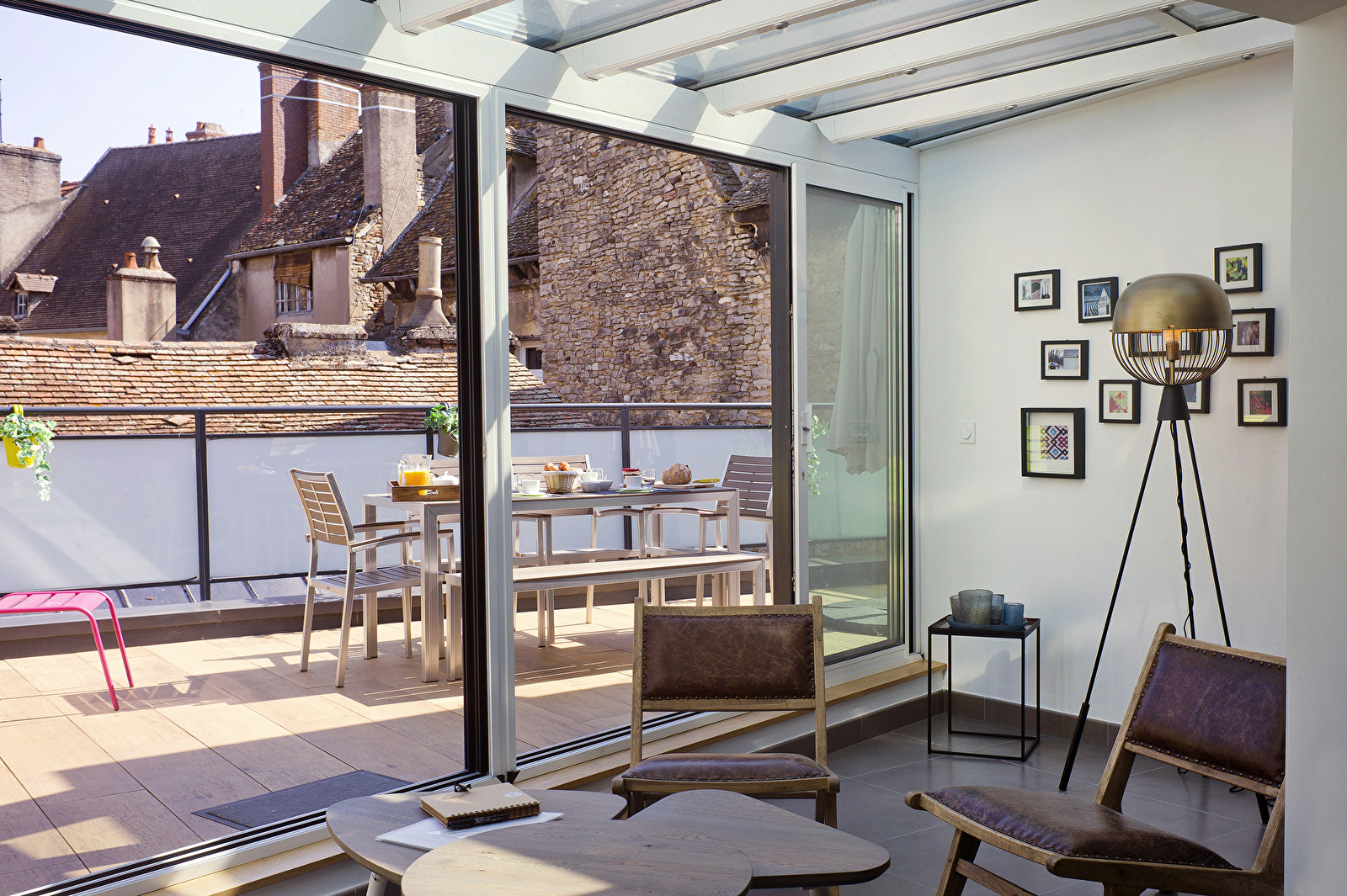 Appartement avec véranda ouvrant sur une terrasse privée de 20 m². Très lumineux, climatisé avec vue sur les toits de Beaune.