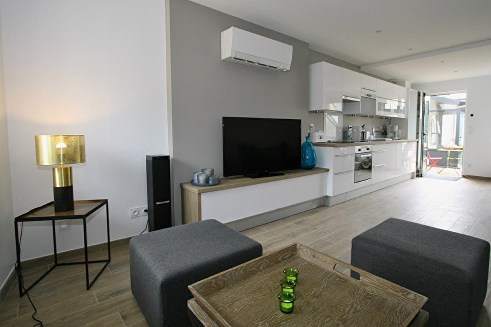 Au dernier étage, accessible par ascenseur, puis escalier privatif, appartement de 50 m² en duplex, offrant au niveau de la terrasse, une pièce à vivre avec cuisine ouverte entièrement équipée, un salon (canapé convertible en lit de 140 cm) et des toilettes.