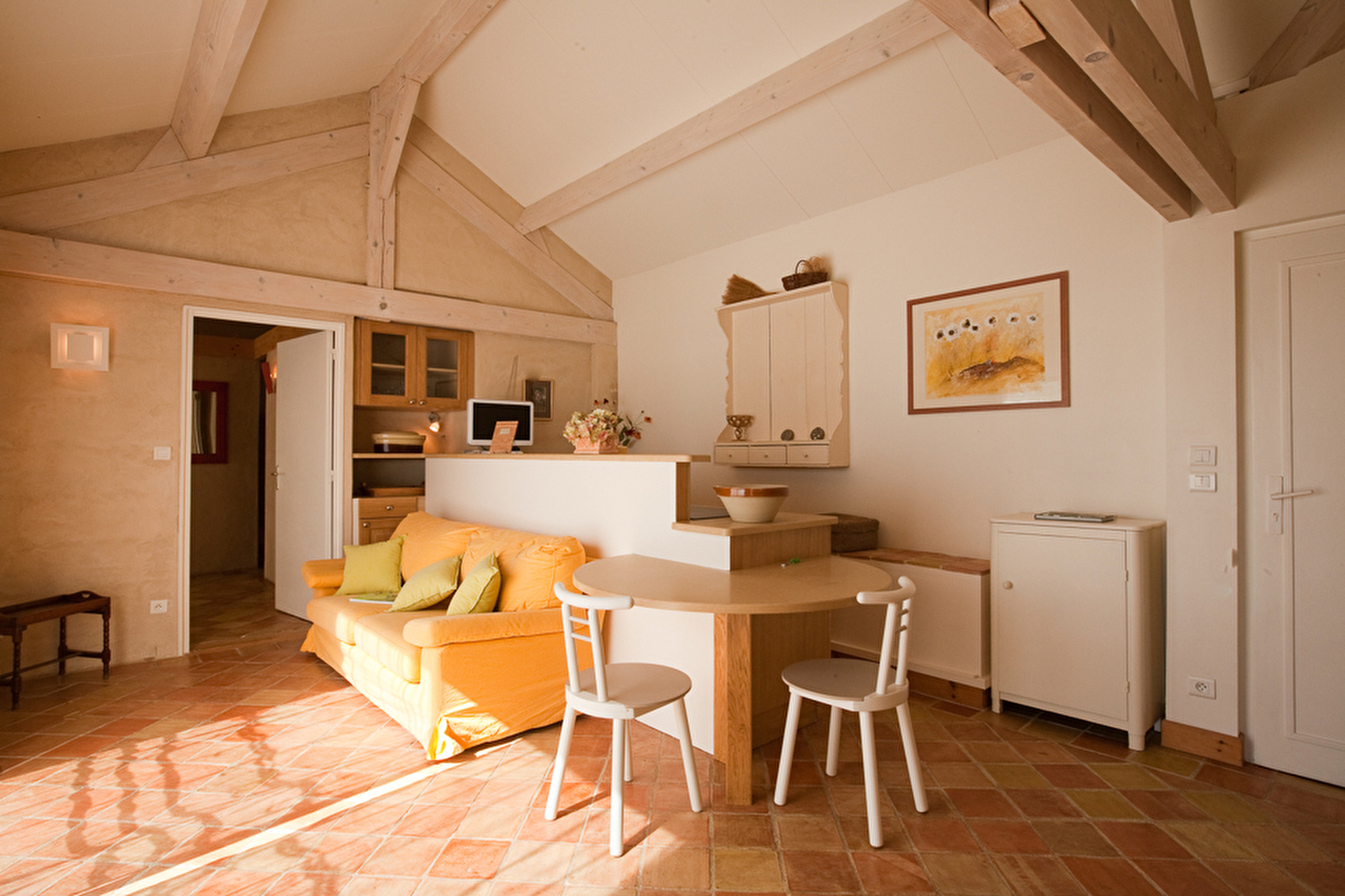 Gîte moderne appelé aussi « maison des enfants » avec 2 chambres et une cuisine-salle à manger. Grands volumes sous charpente apparente et chaleur des matériaux anciens : sol en terre cuite, murs en chaux et chanvre. L’exposition plein Est apporte lumière et chaleur sur la grande terrasse et dans la maison. Le jardin étagé est calme et très privé car clos par un mur en pierres sèches. Une des 2 salles de bain a été faite dans la maisonnette en pierre du vigneron. – 76 m2