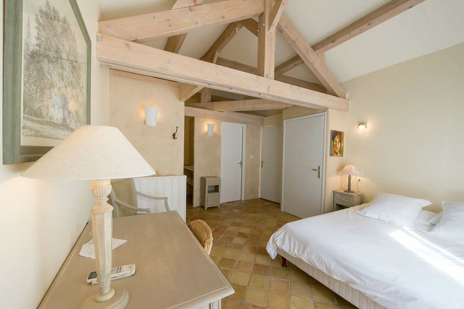 - 2 chambres doubles en suite, Les Myosotis et Les Pâquerettes avec chacune : grand lit (Queen size), coin bureau, salle de bain avec douche et vasque, toilettes