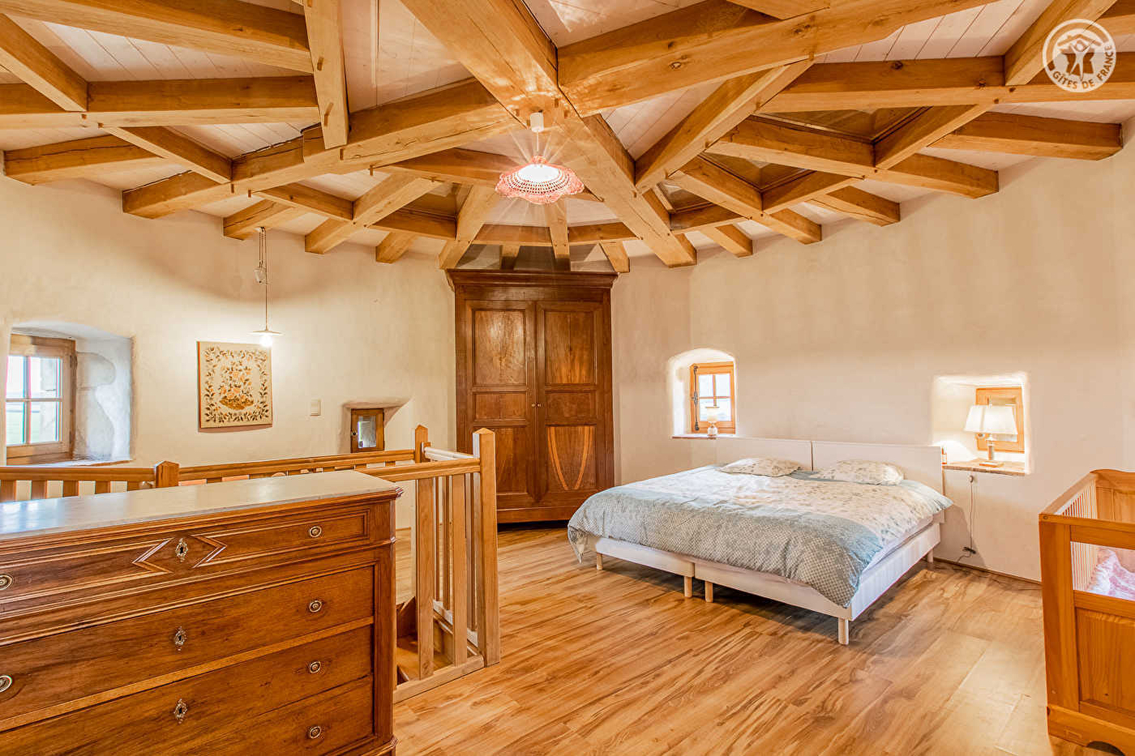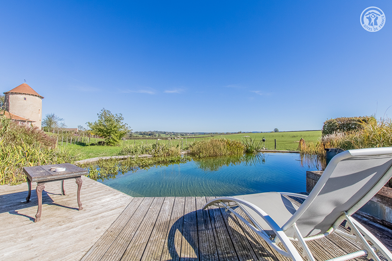 Authentique "Tour de garde" du XVe, exceptionnel édifice médiéval soigneusement restauré, chargé de grande histoire, blotti au calme sur une vaste propriété familiale de 10 ha (jadis "place forte" avec château fort). Paisible mini hameau rural lové en pleine campagne, au creux du bucolique bocage local, sur un vaste plateau de prairies (avec les célèbres vaches charolaises comme voisines), à deux pas d'une belle forêt préservée. Gîte de très bon confort aux dimensions nobles. Ultra spacieux. Très beaux volumes. Architecture intérieure totalement insolite. Chaleureux cachet campagnard aux accents "bourgeois" magnifié par une restauration patrimoniale d'exception (sublime charpente à étoiles reconstruite à l'identique, conservation des anciens murs & corbeaux en pierres, plafonds à la française, manteau de cheminée, linteaux en pierres & bois, tomettes…). Énormément de charme & caractère. Cosy & douillet. Ambiance envoûtante, 100% dépaysante. Agréable cour-terrasse pavée close ombragée sous une treille de vigne complétée par une terrasse exposée ouverte sur les prés offrant une magnifique vue dégagée sur la campagne environnante. Vaste jardin soigné en commun doté d'une atypique piscine naturelle (8x4m), d'un terrain de pétanque & d'un verger (pommiers, poiriers, figuiers etc…).