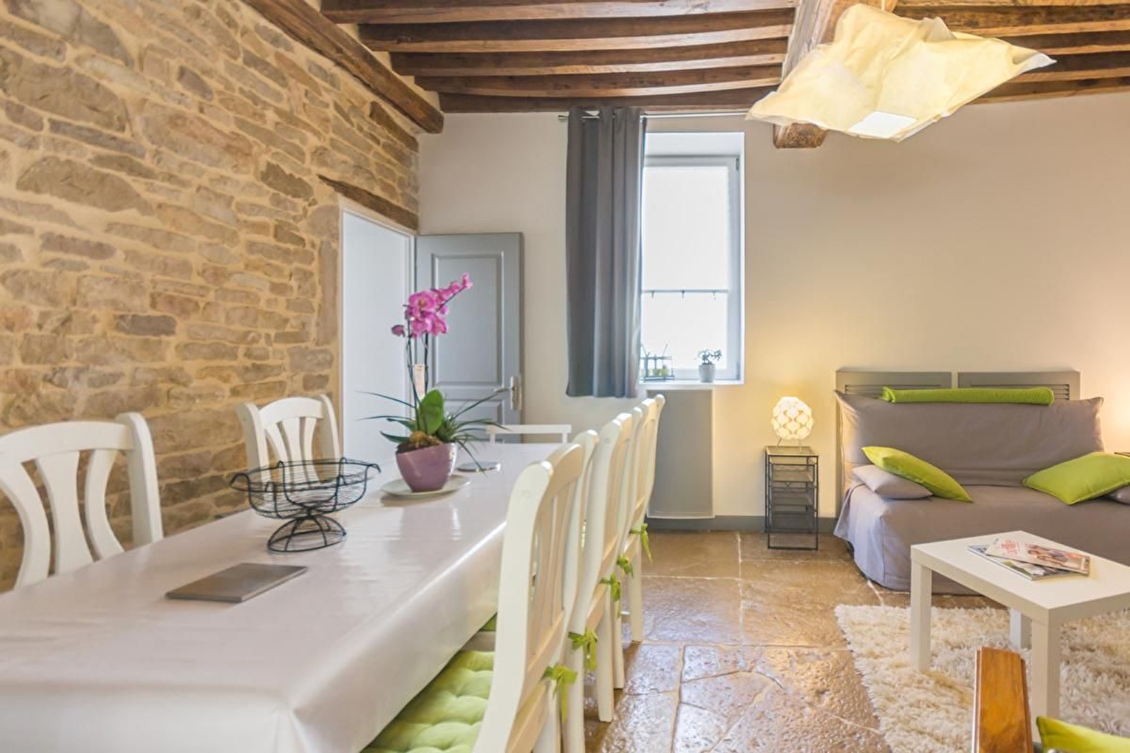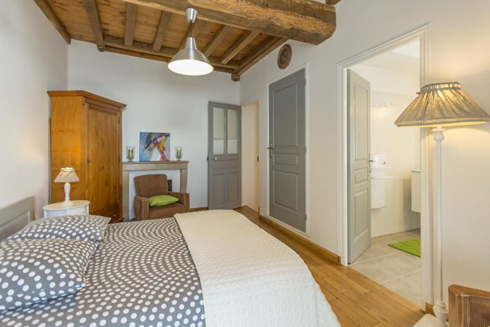 Au rez-de-chaussée : salle à manger - salon de caractère avec dalles de bourgogne, pierres et poutres apparentes. Petite cuisine. Salle d'eau avec WC.
