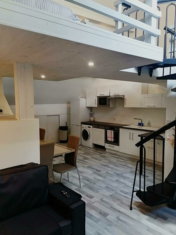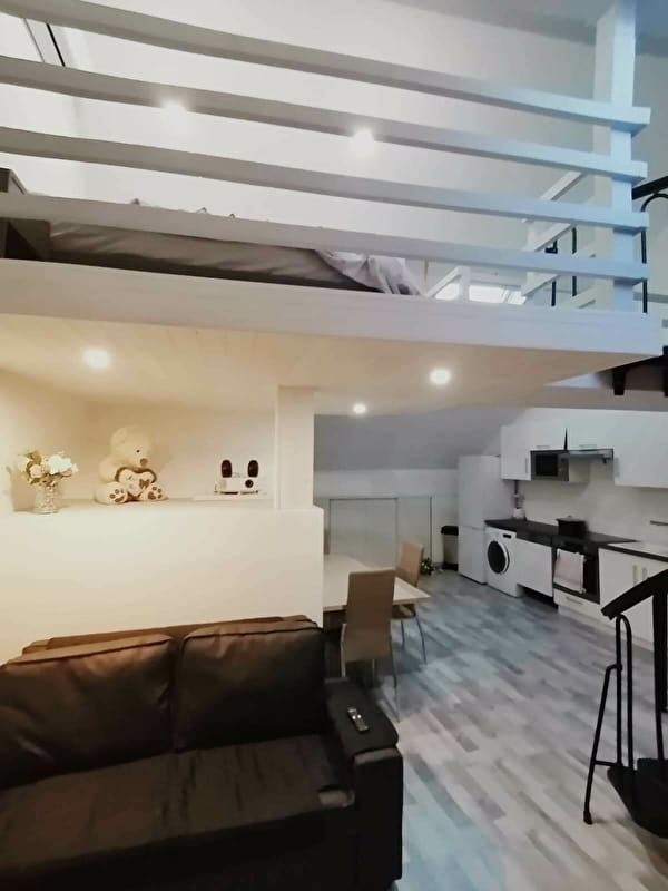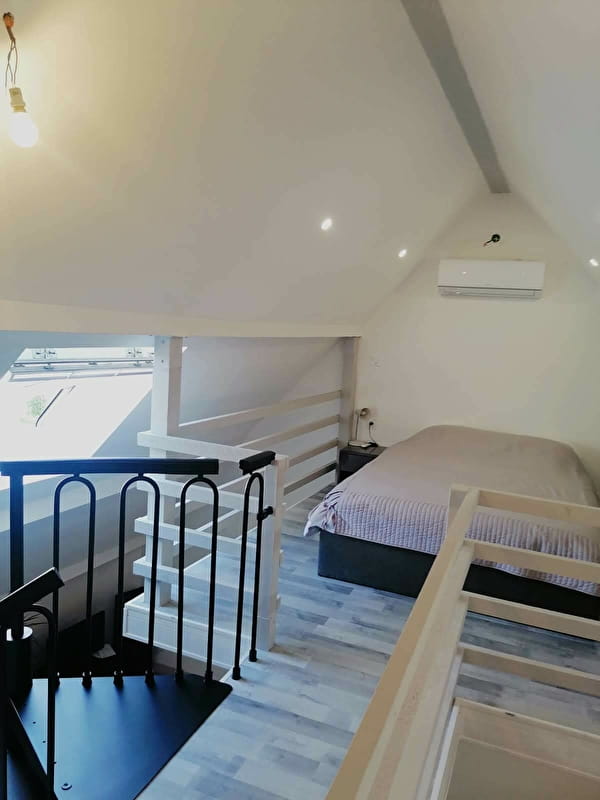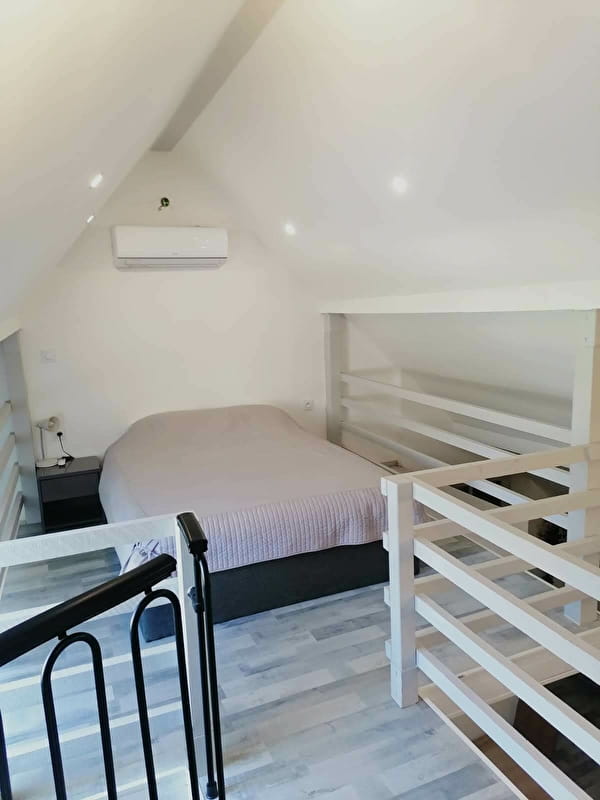 Vous disposez d'un lit 2 places en mezzanine et 1 canapé convertible 2 places.