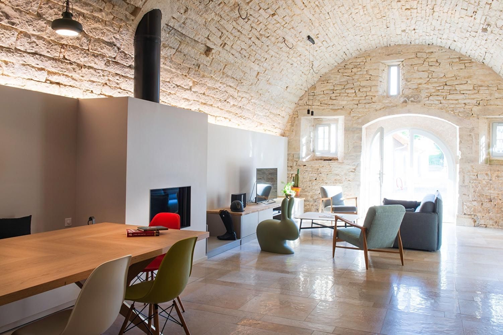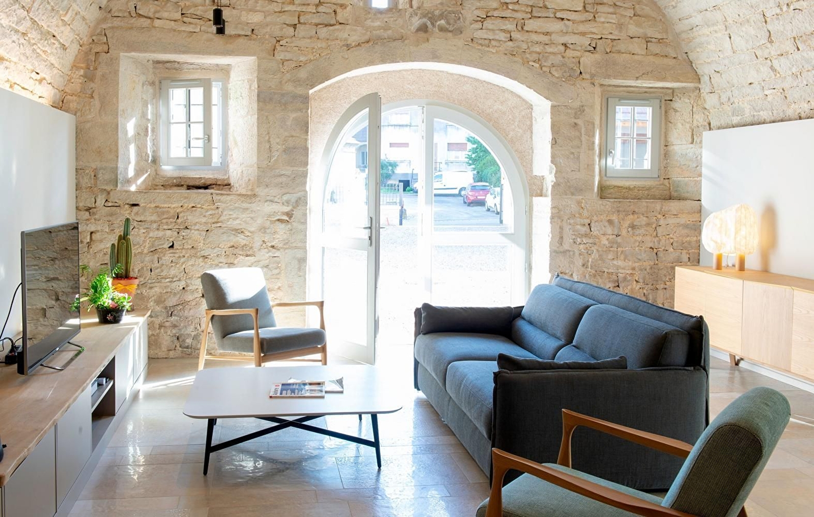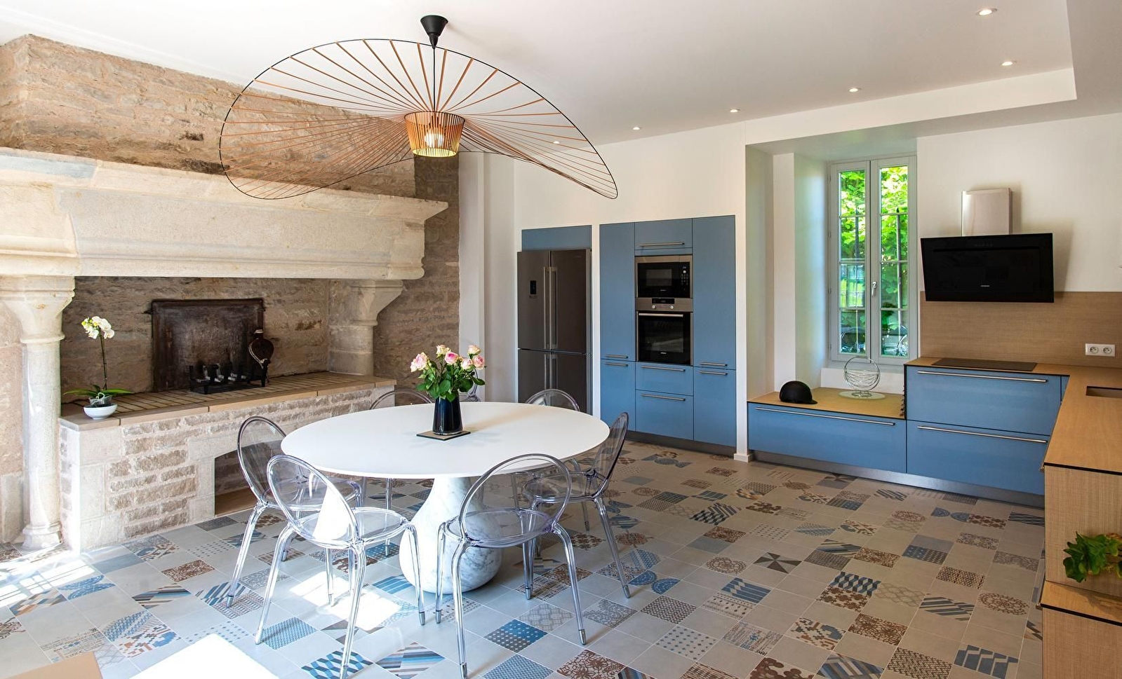Au rez-de-chaussée: magnifique salon (canapé lit convertible pour un couchage supplémentaire) avec espace cuisine en pierres apparentes et plafond voûté, cheminée, cave à vins. Le majestueux escalier en colimaçon, en pierres de taille, donne accès au premier étage: deuxième cuisine équipée, avec une cheminée d'époque et un subtil mariage de style scandinave, spacieux salon épuré, tout en luminosité. Au deuxième étage, 3 chambres: 2 chambres avec lits doubles, 1 chambre 3 personnes (1 lit double, 1 lit simple) avec salle d'eau privative. Une deuxième salle d'eau.