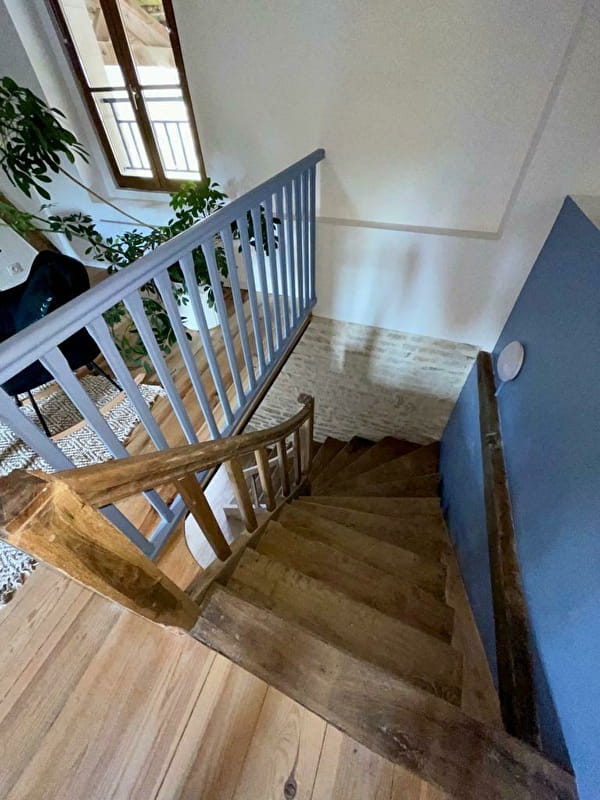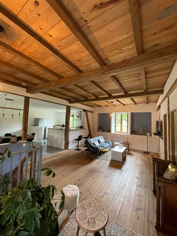 A l'étage, son magnifique espace de vie lumineux avec ses poutres apparentes créé une ambiance chaleureuse de partage avec sa salle à manger, sa cuisine intégrée avec son bar ouvert....