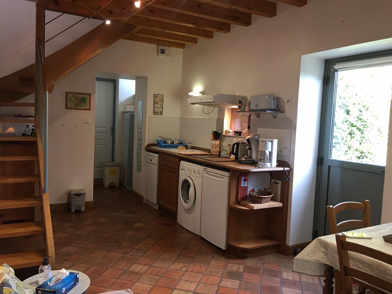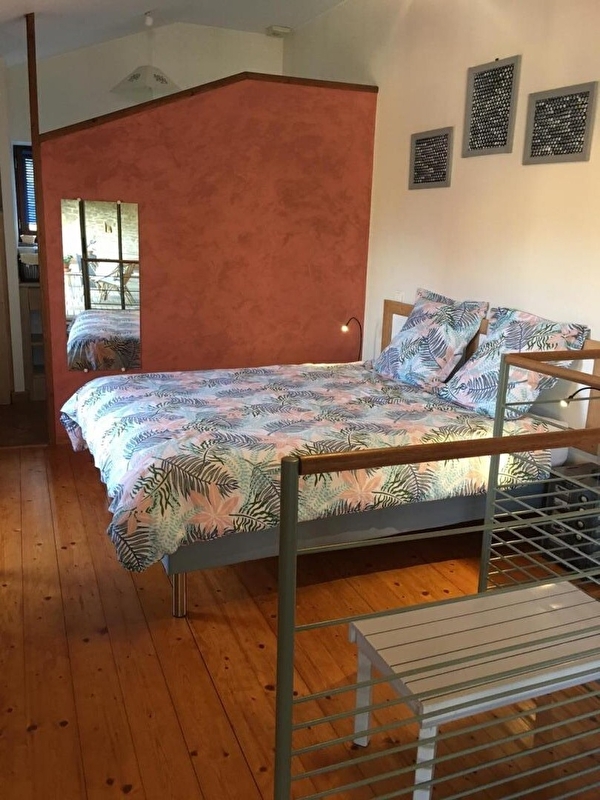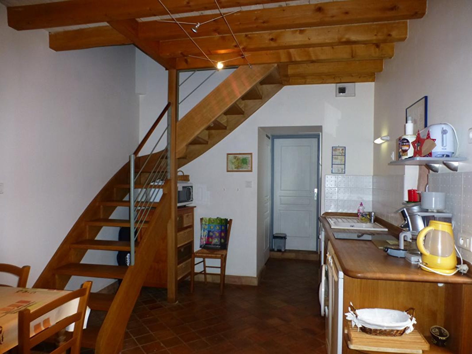 Composition : Maison de village mitoyenne jouxtant l'habitation des propriétaires (indépendance totale). Wifi. Chauffage électrique. Rdc : séjour-cuisine-salon (canapé BZ convertible 2 p. 140x190cm en appoint), Wc indépendant. 1er étage : chambre (lit 2 p. 160x200cm) avec salle de bain en espace ouvert (baignoire). Terrasse abritée + parking privés. Jardin clos en commun avec propriétaires. Local vélos. Toutes commodités 4.5 km.