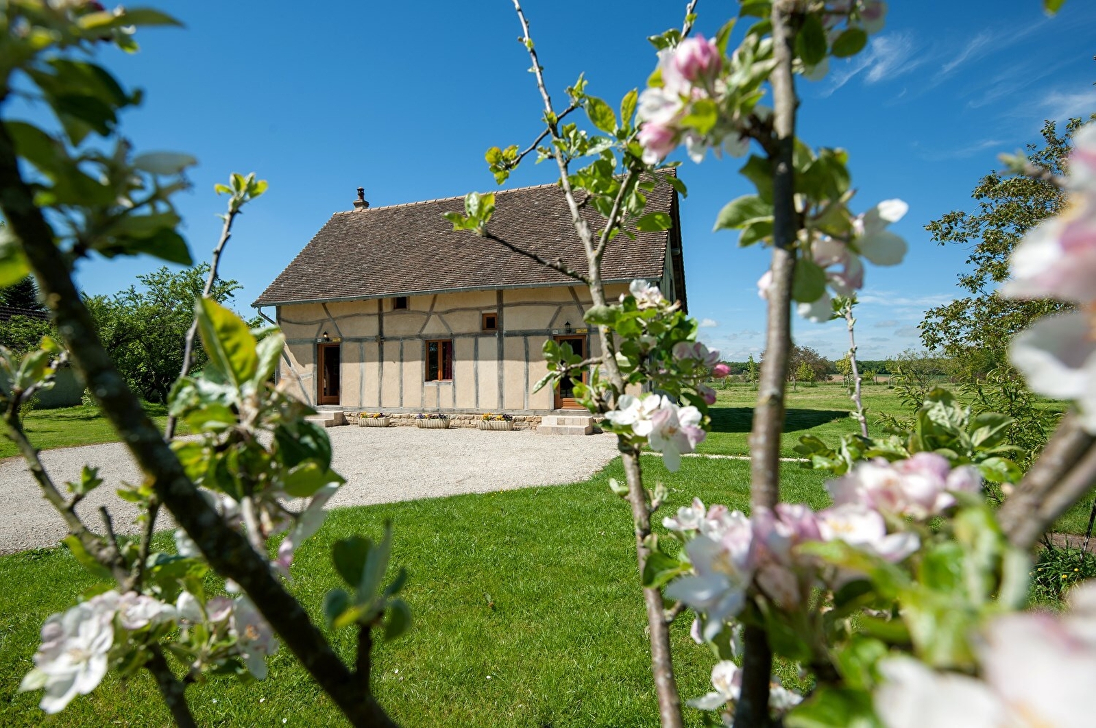 Très élégante demeure contemporaine aménagée dans le strict respect des codes architecturaux traditionnels du pays (construite et aménagée en briques & pans de bois avec torchis, telle une authentique ferme bressane d'époque) sise sur un ancien petit domaine agricole familial intégralement revisité en confortable villégiature (propriété comprenant 3 gîtes). Calme & tranquillité totales au cœur d'un paisible petit hameau rural résidentiel de la douce campagne chalonnaise, lové en lisière immédiate de champs & prairies, à deux pas d'un bucolique étang & de la vaste forêt domaniale de Gergy, immense « poumon vert » du territoire à parcourir lors d'apaisantes promenades à pied comme en VTT. Agréable environnement champêtre & naturel préservé, à 3 km du bourg typique d'Allerey-sur-Saône, chargé de grande histoire de par sa rente de situation (situé tout à la fois sur les rives de la Saône & l'ancienne voie romaine Agrippa), tour à tour port fluvial majeur du pays Beaunois & de ses vins jusqu'au XVIIème siècle, important nœud ferroviaire de voyageurs & marchandises (19ème/début 20éme) puis l'un des 20 rares « camp-hôpital américain » durant la 1ère guerre mondiale. Spacieux gîte de bon confort. Chaleureux cachet campagnard de style & caractère. Large terrasse privative ouverte sur un agréable jardin en commun engazonné & arboré, espace réservé aux deux gîtes niché sur une vaste propriété soignée & fleurie disposant d'un verger fruitier (cerisiers, pruniers, pêchers, pommiers, poiriers… / cueillette possible).