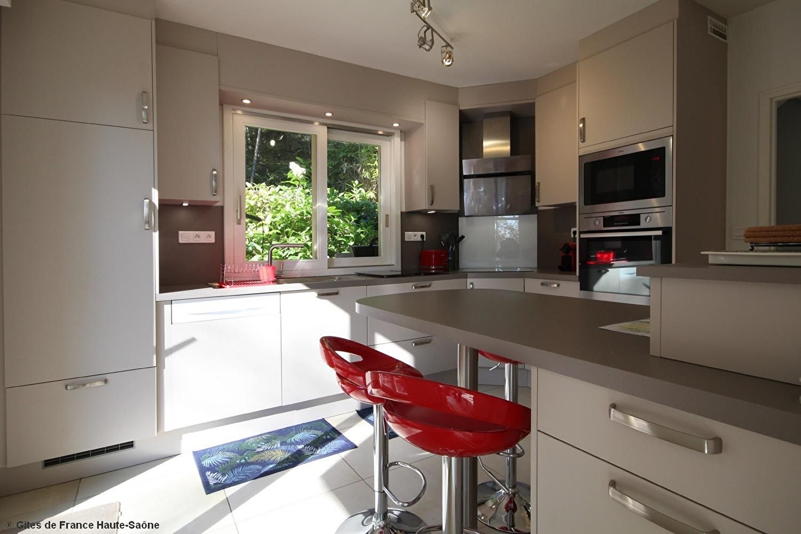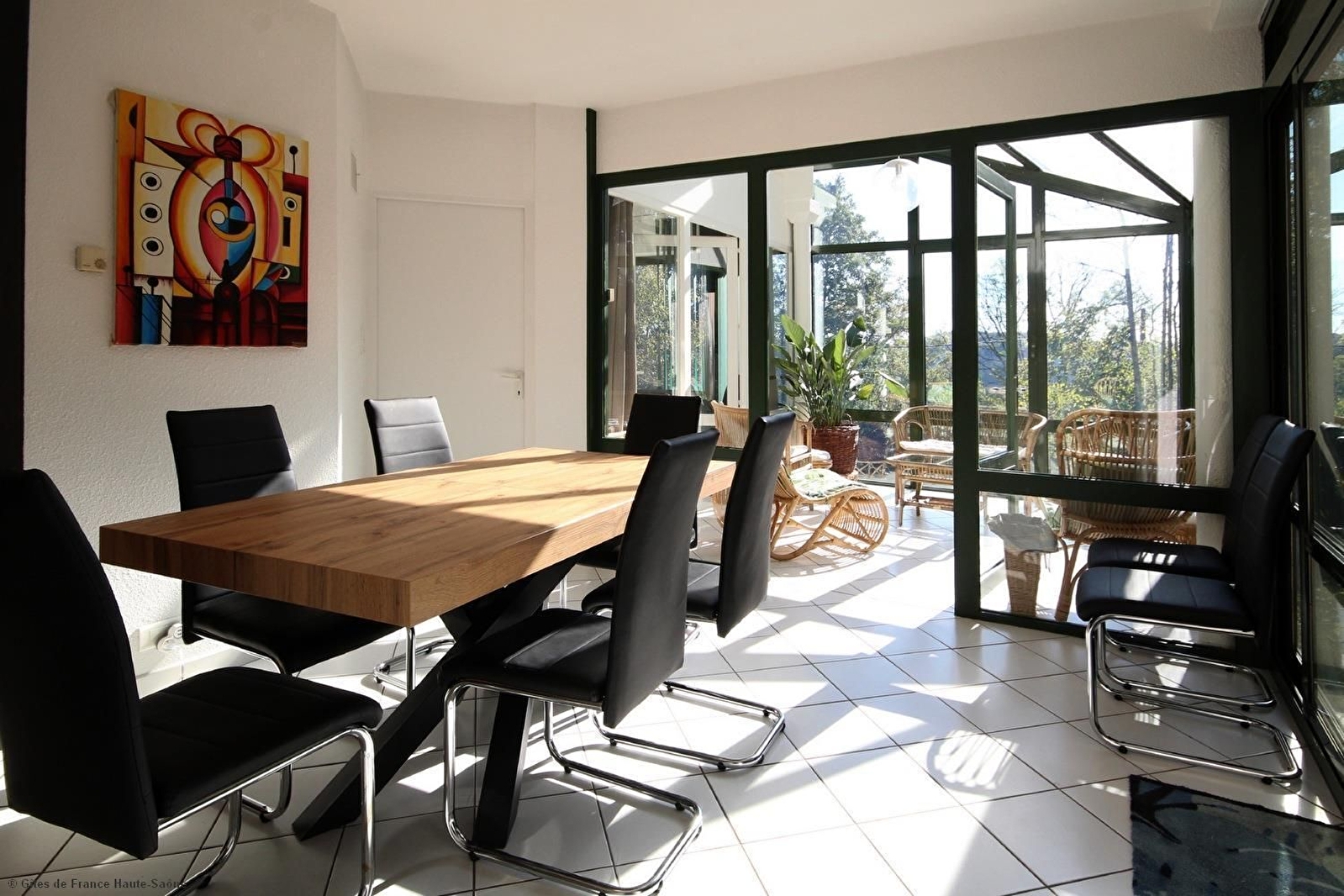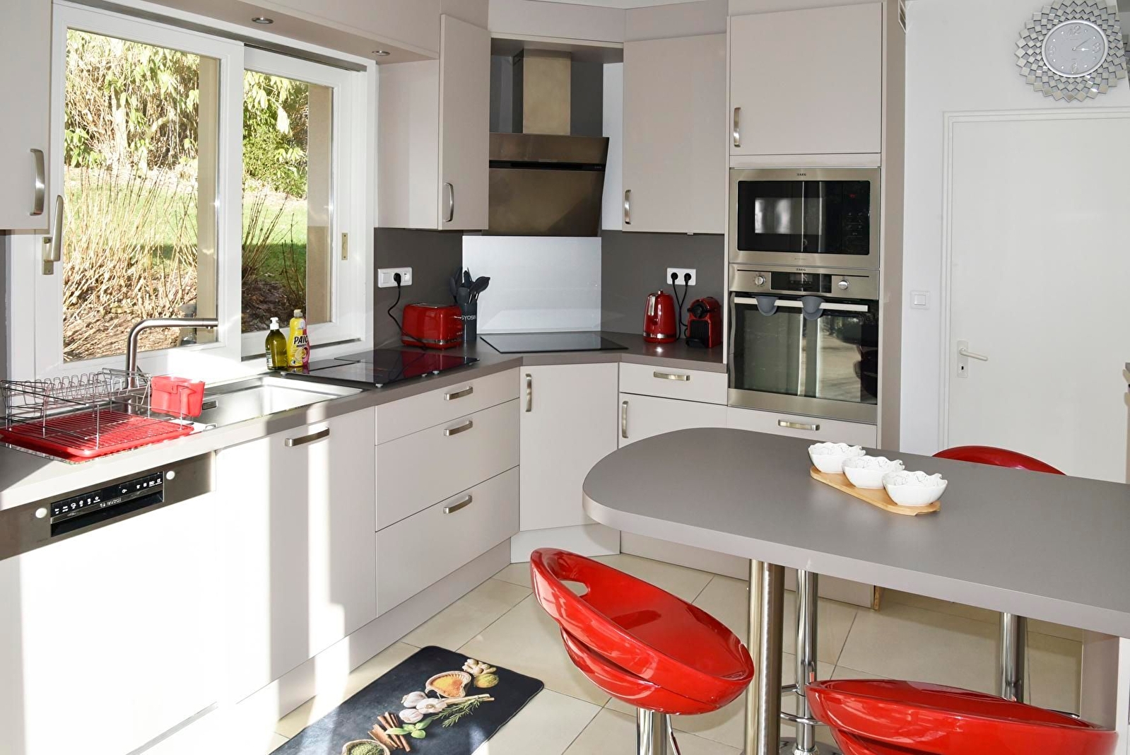 Idéale pour un séjour en famille ou entre amis, sur 3 niveaux, comprenant, au sous-sol : 1 salle de fitness avec de nombreux appareils, 1 salle de jeux avec billard américain, jeux de société, barre de son Bluetooth, 1 buanderie avec lave-linge et sèche-linge. Au rez-de-chaussée : un salon/salle à manger moderne à la décoration soignée, avec TV écran plat, donnant sur une véranda lumineuse avec vue sur le parc, une cuisine toute équipée avec électroménager de qualité, 1 bureau/bibliothèque, 1 chambre double avec 1 lit King Size de 180X200, 1 salle de bains avec baignoire et douche, 1 WC indépendant. A l'étage : mezzanine, 4 chambres : 1 chambre "enfant" avec 2 lits de 90X200, 3 chambres avec chacune 1 lit Queen Size de 160X200, une salle d'eau, 1 WC indépendant. A l'extérieur, une jolie terrasse aménagée avec transat et bain finlandais (inclus dans le prix de location). Un kiosque en bois avec salon de jardin pour prendre vos repas à l'abri, tout cela sur un terrain de 4000 m², au cœur d'une forêt. La villa bénéficie d'une vue exceptionnelle sur la nature, dans un lieu calme et préservé, un véritable havre de paix.