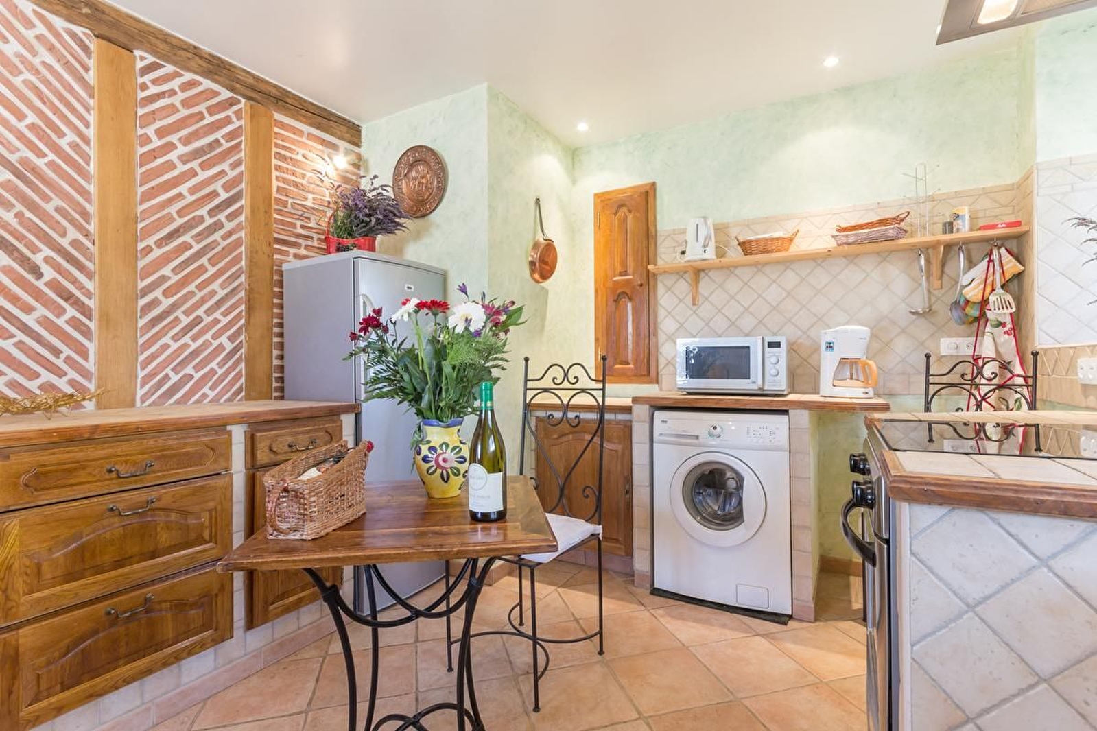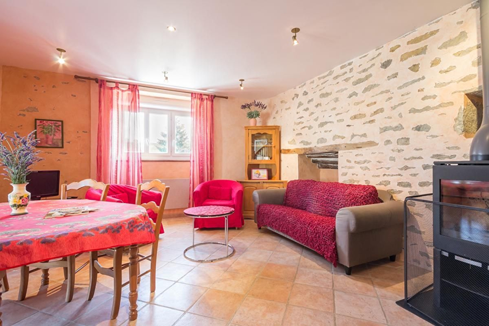 Rez-de chaussée carrelé : cuisine intégrée claire et accueillante. Salle à manger/salon ouverts sur l'extérieur avec mur en pierres apparentes et poêle à bois qui donne une chaleureuse ambiance à la pièce. WC. A l'étage (en parquet) : 2 chambres une avec 1 lit 140 et la seconde avec 2 lits en 90 jumelables donnant sur une terrasse. Chacune avec salle d'eau et WC.