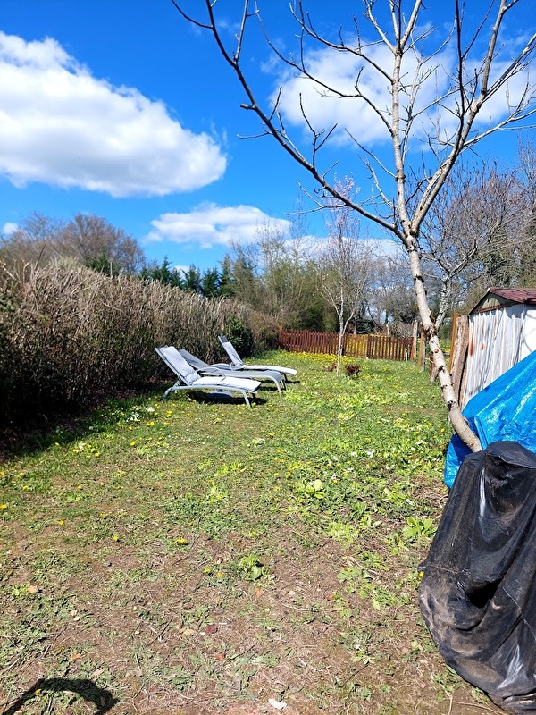 Jardin cloturé avec transats table et chaises,