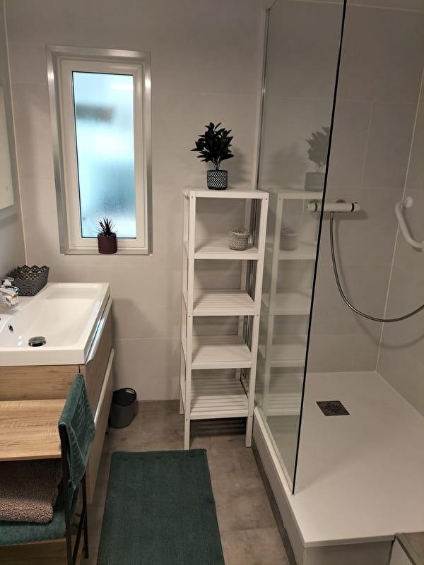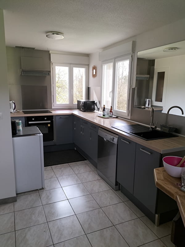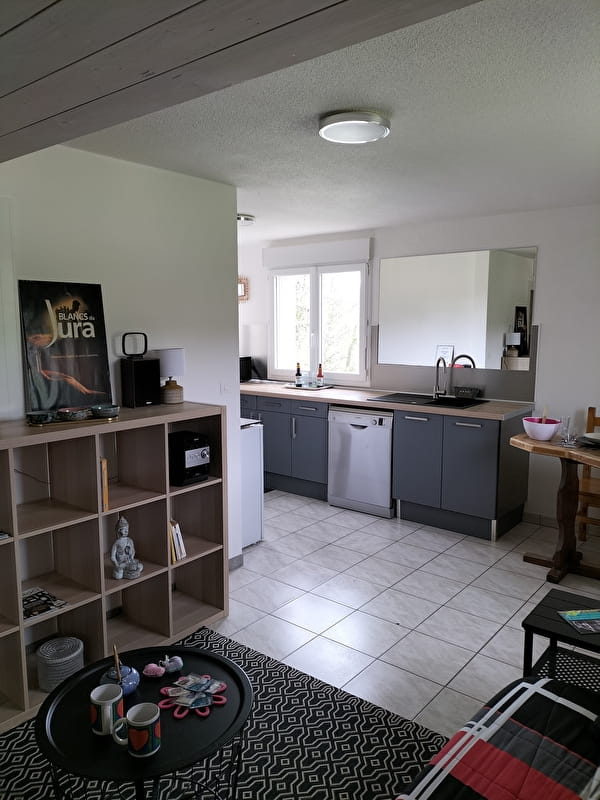Cuisine équipée micro-ondes, four, réfrigérateur, lave-vaisselle, séjour salon avec un canapé convertible.