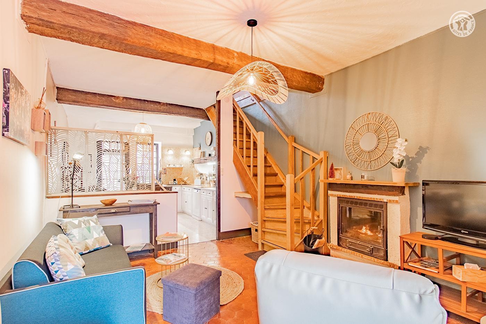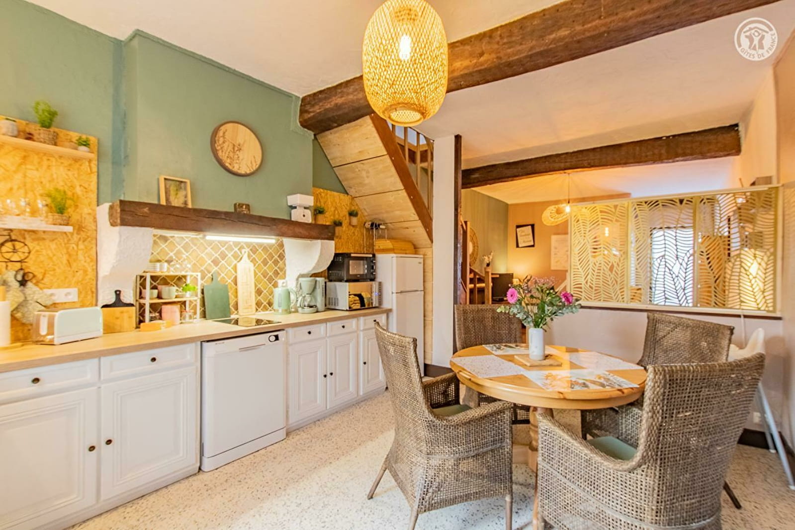 Composition : Maison de village mitoyenne. Wifi (fibre). Chauffage électrique + cheminée. Gîte duplex au 1er étage (accès par un escalier extérieur). 1er étage : séjour-cuisine-salon (canapé convertible 2 p. 140x190cm en appoint), Wc indépendant. 2ème étage : 2 chambres en enfilade (2 lits 1 p. 80x200cm jumelables en lit 2 p. 160x200cm / lit 1 p. 90x190cm), salle d'eau (douche multijets). Jardinet clos (à 20m / non directement attenant au gîte) + mini véranda + balconnet privatifs. Parking public gratuit aisé sur place. Commodités à 5 km.