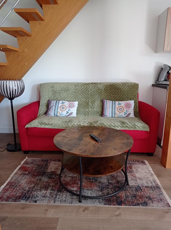 Composition : Maison individuelle jouxtant la maison des propriétaires (indépendance totale sans vis-à-vis). Wifi. Chauffage Pompe à Chaleur. Climatisation. Gîte sur 2 niveaux en duplex. Rdc : séjour-cuisine-salon (canapé convertible 2 p. 140x190cm en appoint), salle d'eau (douche), Wc indépendant. 1er étage : 2 chambres (lit 2 p. 160x200cm / 2 lits 1 p. 90x200cm). Jardinet clos (130m²) + terrasse + parking privatifs. Local vélos disponible côté jardin des propriétaires. Petits commerces à 6 km. Commodités & supermarché à 8 km.