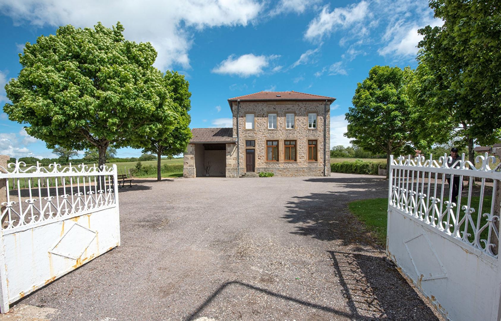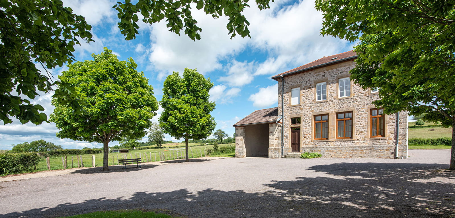 Ravissante authentique ancienne école de village pétrie d'histoire - édifice de la fin du XIXe siècle, typique de la 3ème république - réhabilitée en gîte & petite salle des fêtes par la commune de Morey, nichée au calme en lisière de champs & prairies (où paissent en saisons les paisibles vaches charolaises), à deux pas du cœur du village. Blotti à flanc de colline à 437m d'altitude, en pleine campagne préservée sur les premiers contreforts de vastes massifs boisés aux belles forêts sauvages riche de divers belvédères panoramiques offrant des vues à couper le souffle (à découvrir lors de reposantes balades à pied ou VTT), au creux d'un bucolique plateau de bocage dominant la douce vallée de la Dheune (traversée par le célèbre Canal du Centre), ce pittoresque mini bourg rural (naguère village viticole) dispose d'un patrimoine notable (élégante église romane du XIIIe, calvaires & lavoirs, vestiges néolithiques & romain) et profite d'un enchanteur cadre paysagé vallonné, totalement apaisant & reposant. Gîte de bon confort. Spacieux & lumineux. Cachet campagnard aux accents contemporains, mixé à l'âme 100% dépaysante des lieux. Grand terrain clos ouvert sur les pâtures environnantes, disposant d'une vaste cour arborée (appréciable parking ombragé l'été), d'une terrasse "sur cour" (exposée ou abritée au besoin sous l'historique vaste préau à l'imposant volume "cathédrale"), d'un terrain de pétanque & d'un terrain naturel niché à l'arrière de la maison. Belle vue dégagée sur la douce campagne alentour.