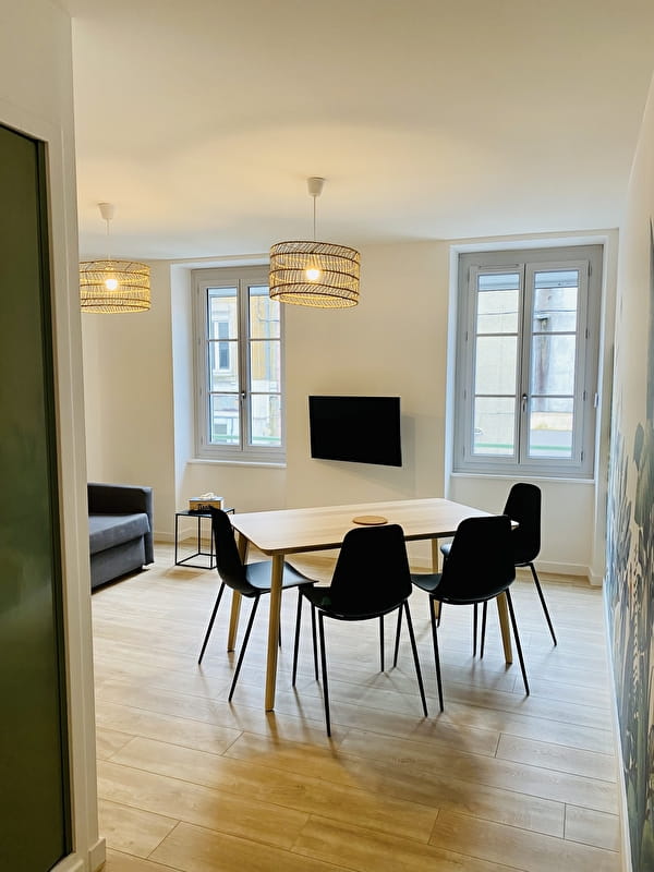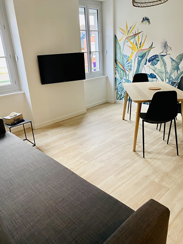 Appartement d'environ 48 m² pouvant accueillir jusqu'à 4 personnes, cuisine équipée : plaque induction, micro-ondes, grille-pain, bouilloire, réfrigérateur, vaisselle, machine à café Nespresso. Chambre séparée avec un lit king size 160x200 cm, salle d'eau, WC, canapé convertible confort, climatisation, TV connectée, wifi.
