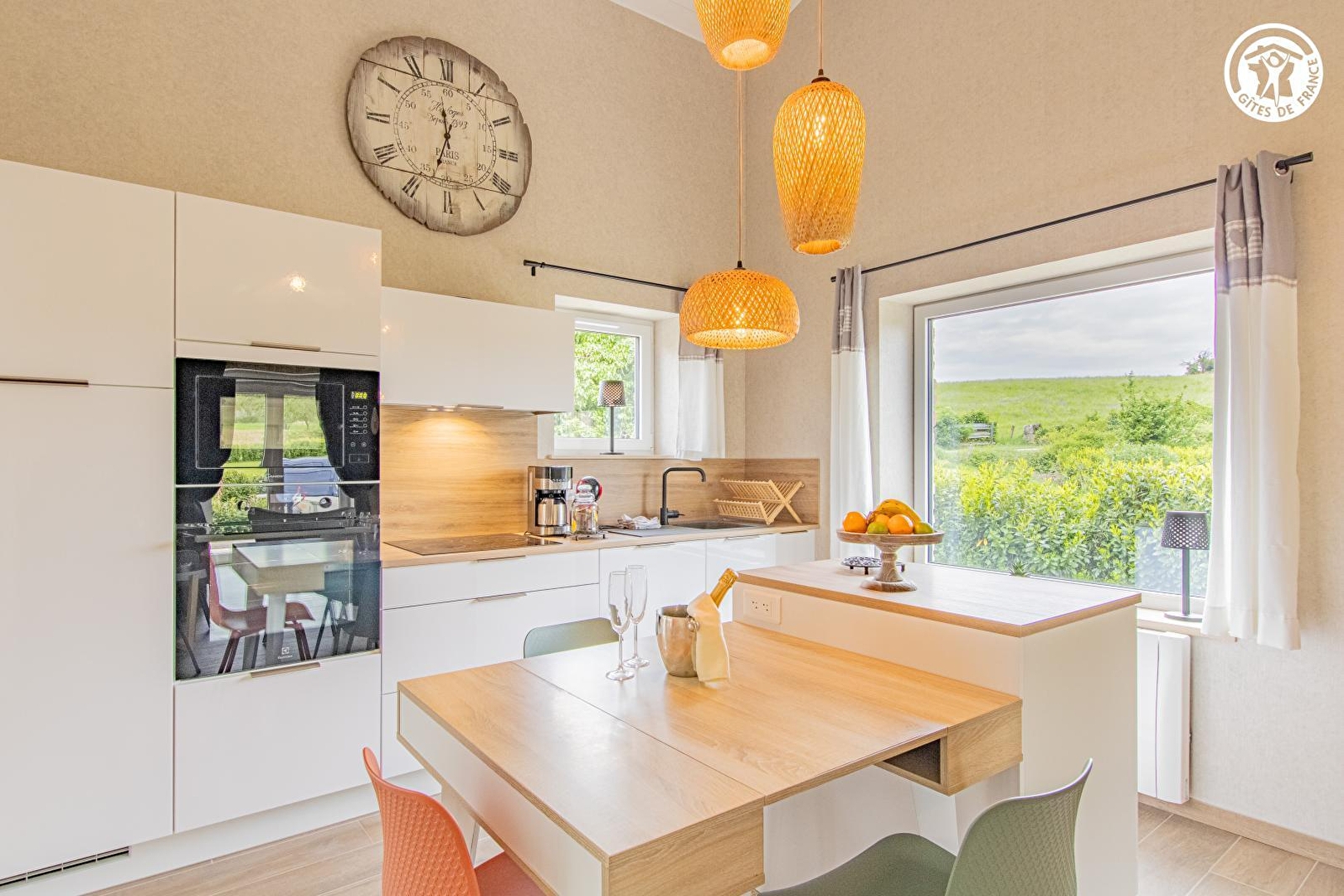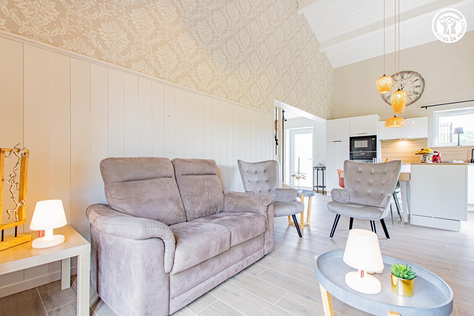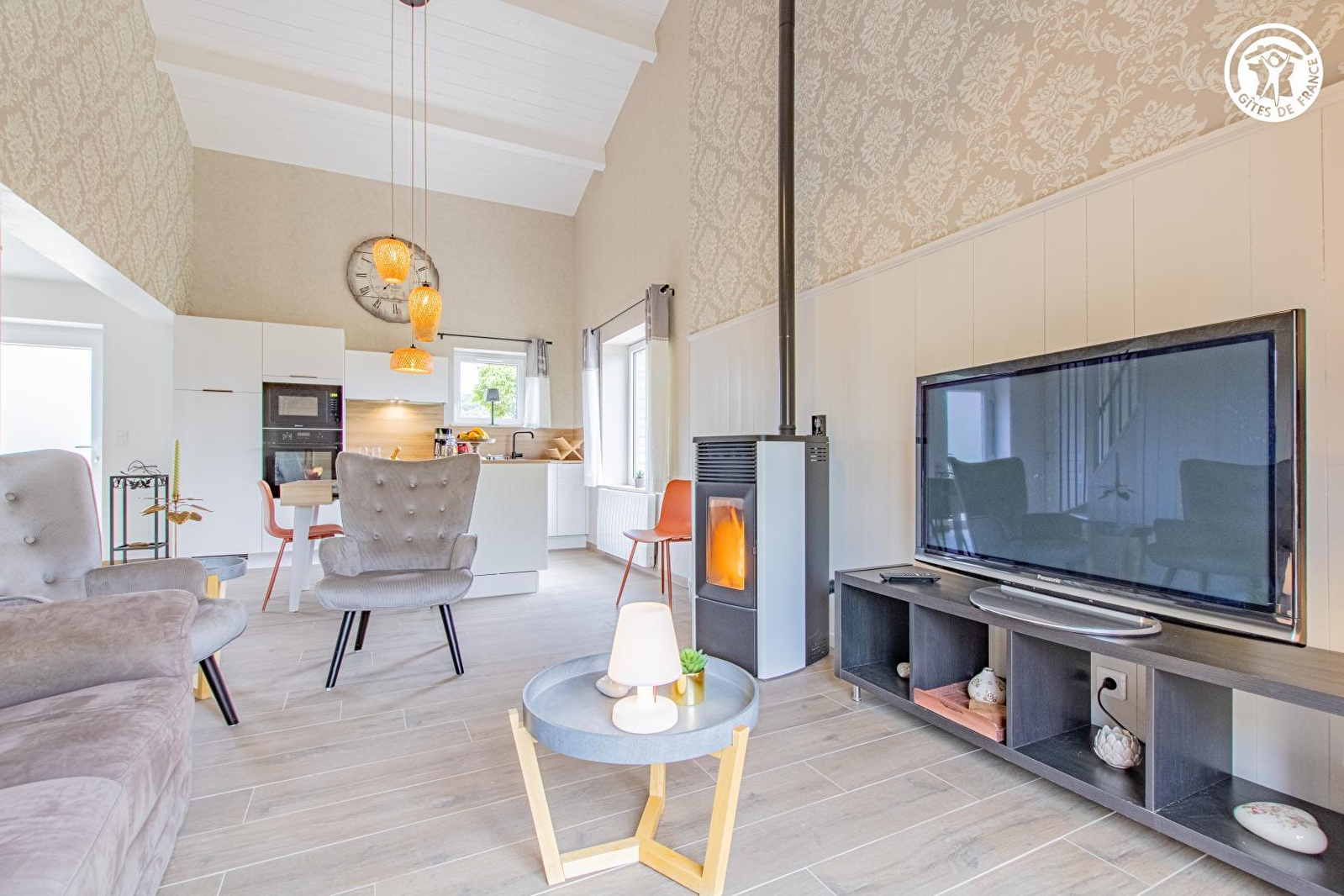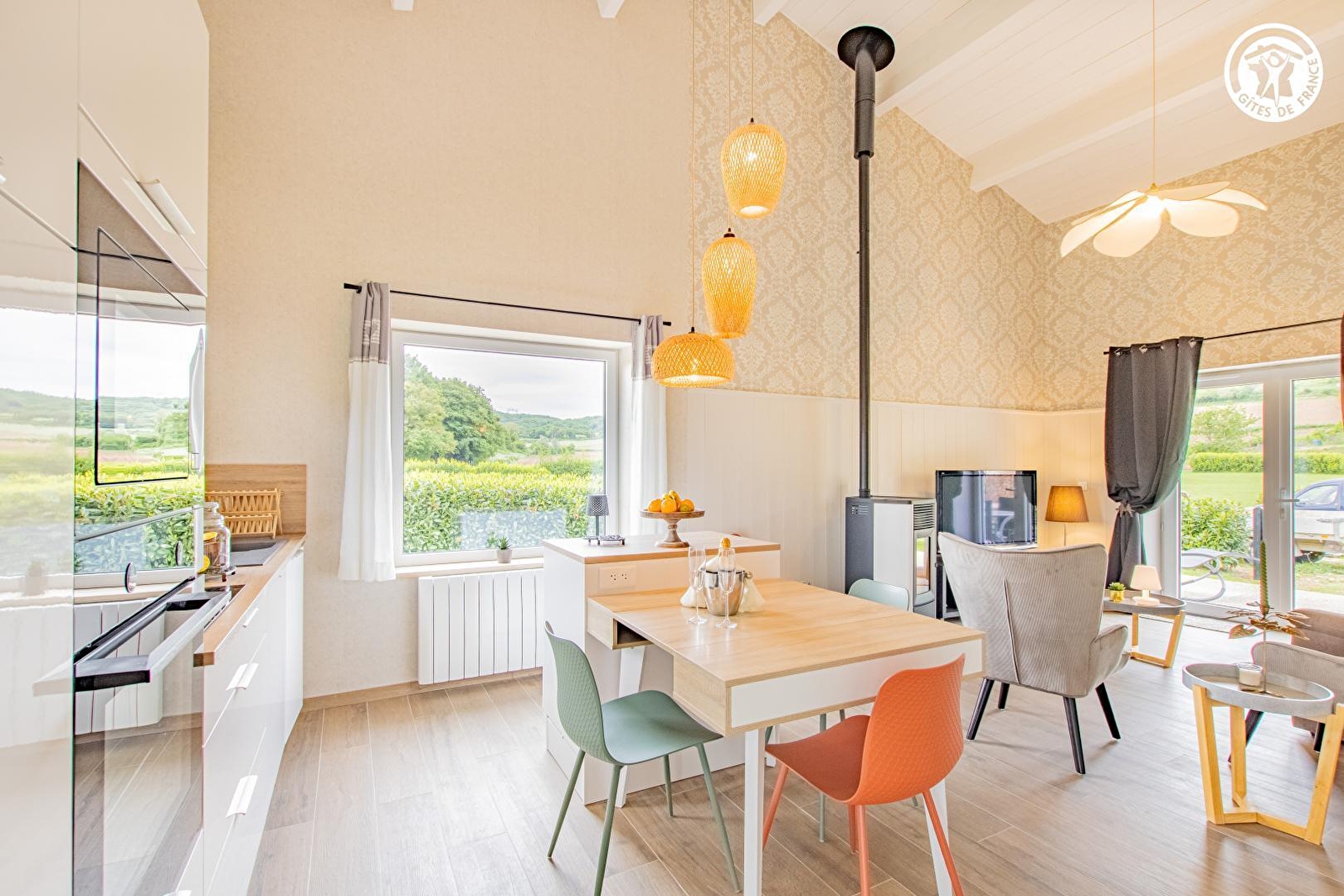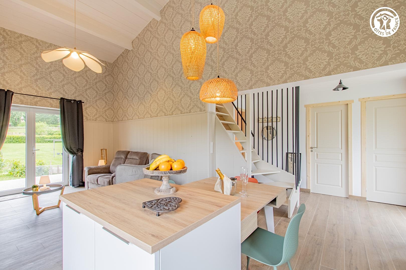 Composition : Gîte mitoyen au garage des propriétaires voisinant leur habitation comprenant un second gîte (indépendance totale). Wifi (fibre). Chauffage électrique + poêle granulés bois. Rdc : séjour-cuisine-salon, chambre (lit 2 p. 160x200cm) salle d'eau (douche), Wc indépendant. 1er étage : chambre en mezzanine (2 lits 1 p. 90x190cm). Terrasse + jardinet + parking privés. Local vélos. Toutes commodités dont supermarchés 8.5 km.