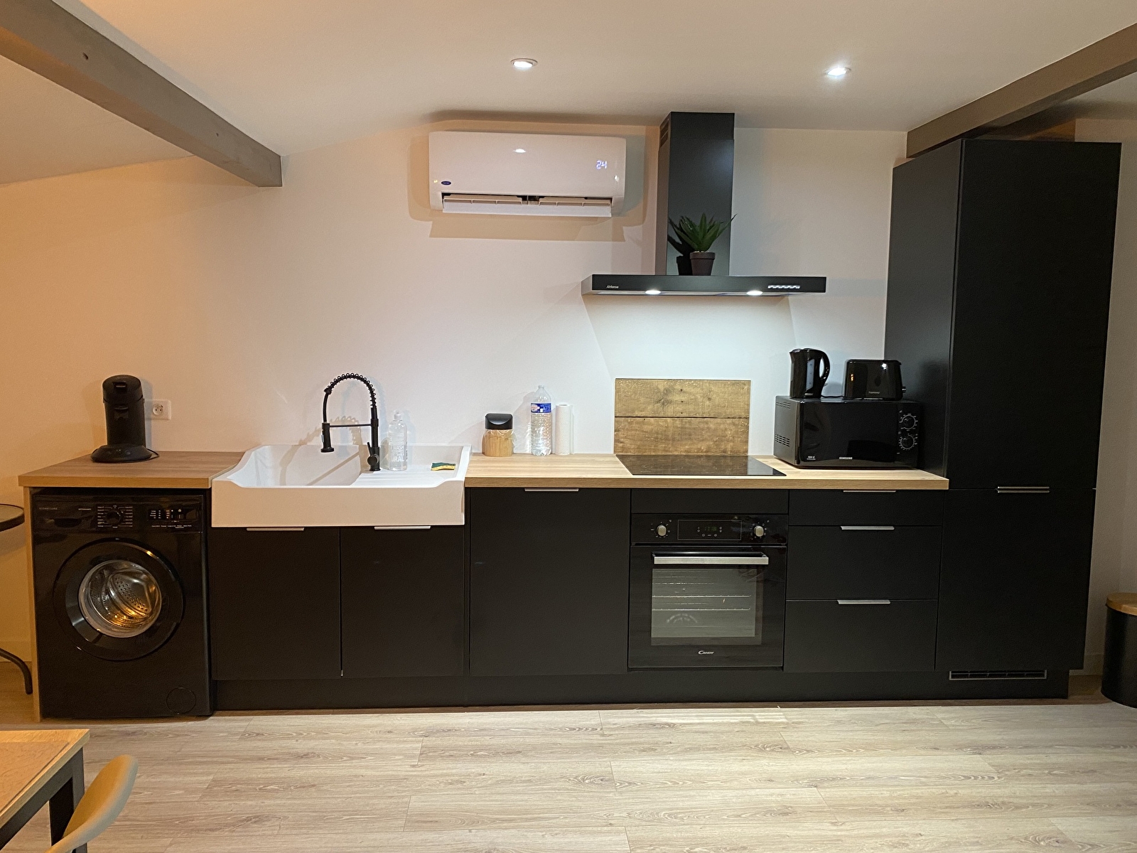 La cuisine, entièrement équipée avec évier timbre, vous permettra de préparer vos repas à savourer dans la véranda ou sur la terrasse privée avec vue sur la nature.