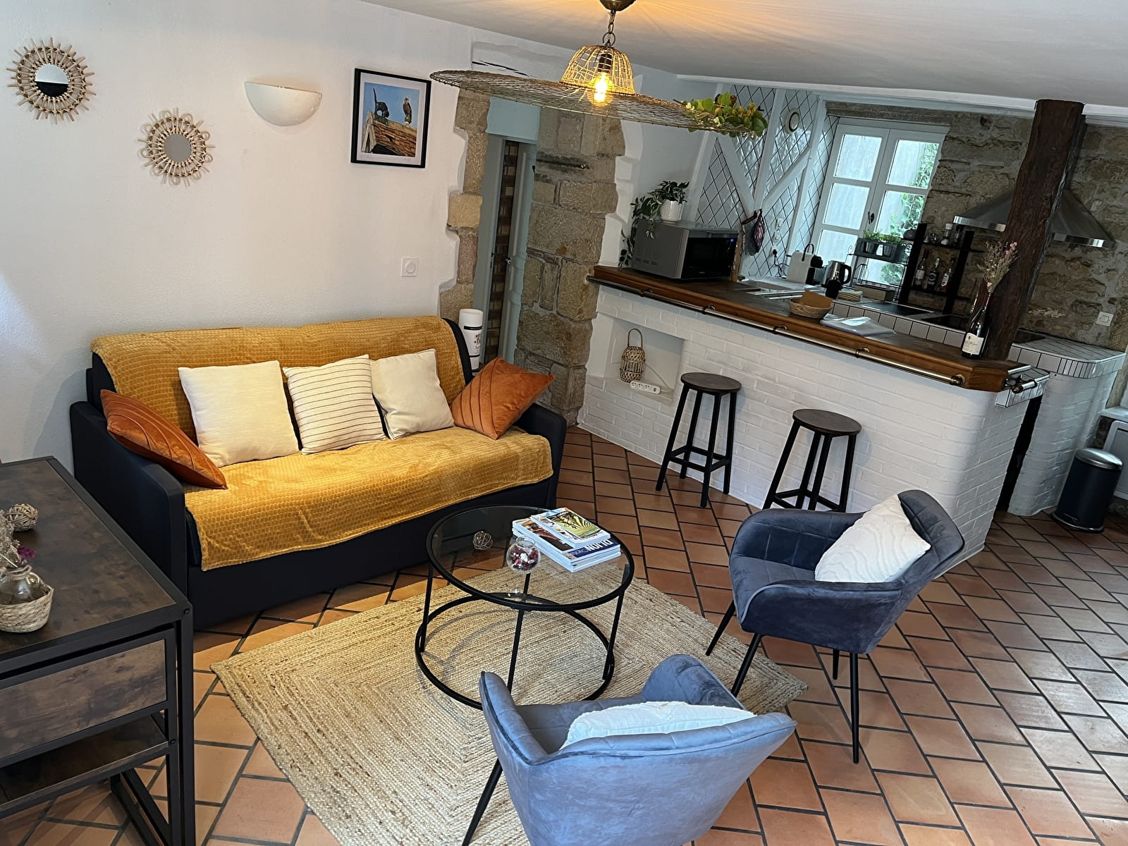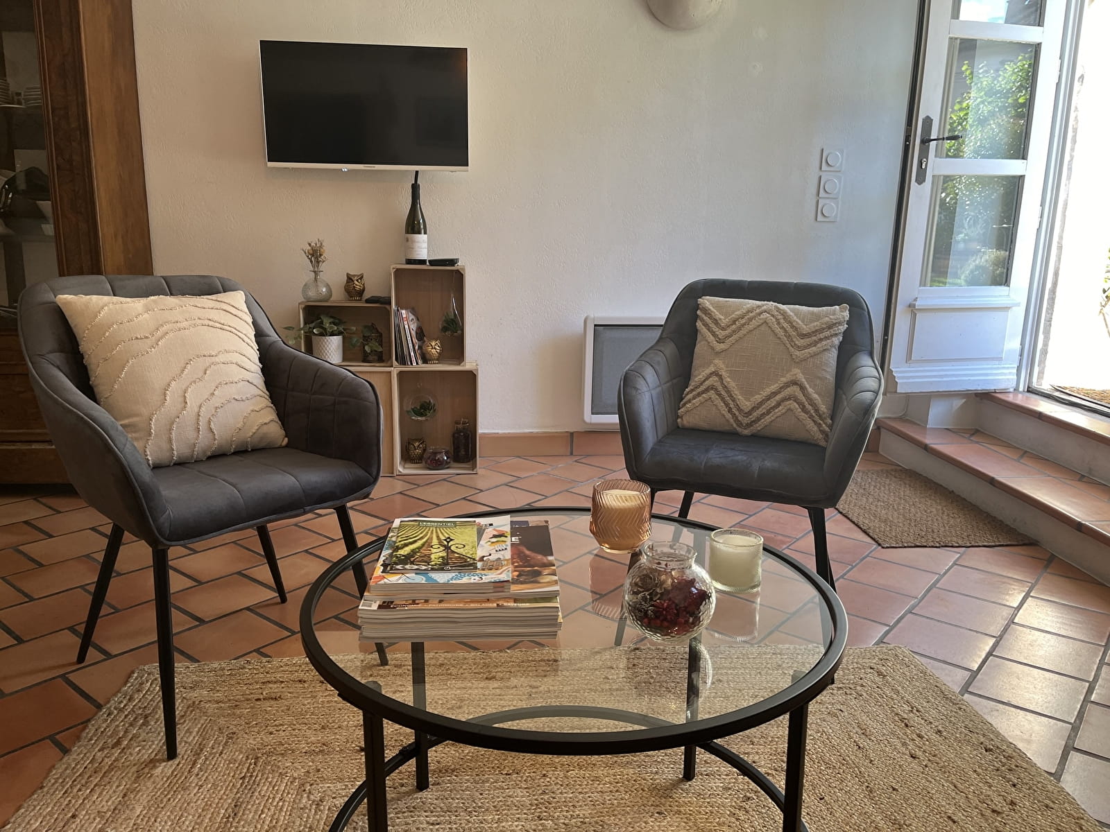 - un séjour, comprenant notamment un canapé à l'assise confortable de qualité italienne, une table basse, 2 agréables fauteuils, une table et 2 chaises (suffisamment légères pour être déplacées dans la pièce à votre gré), une télévision connectée à écran plat, le wifi ;