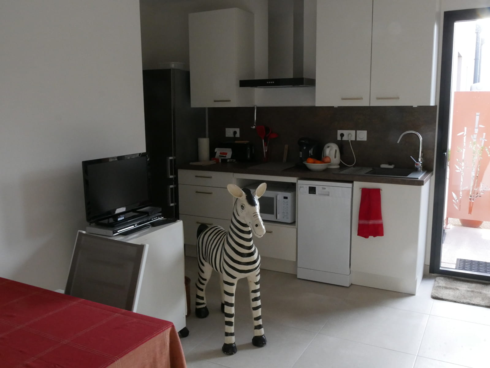 - une kitchenette avec grand réfrigérateur/congélateur : 2 plaques à induction, un four micro-ondes, un lave-vaisselle 6 couverts, une machine à café Bosch Tassimo avec dosettes et sachets de thé, un grille-pain, une bouilloire électrique et tout le matériel nécessaire en correspondance avec les 3 étoiles (liste officielle établie par l’Office de Tourisme du Grand Chalon)