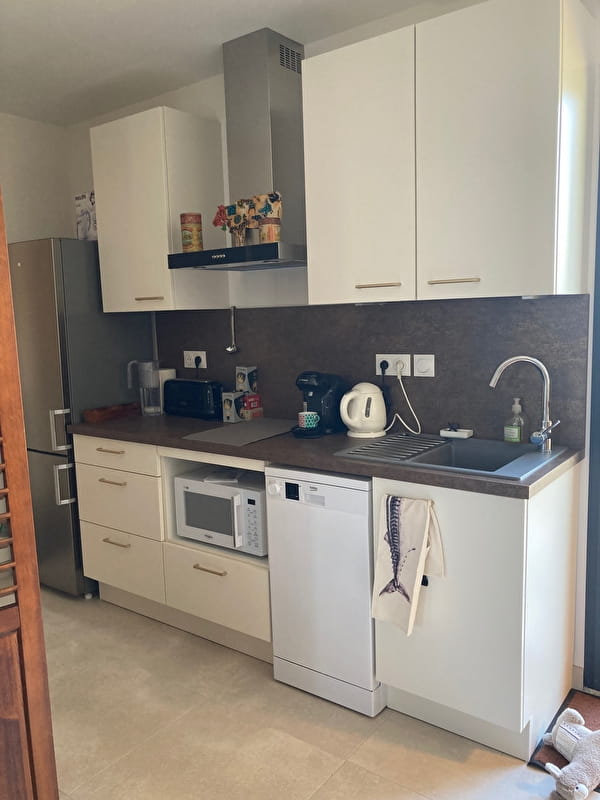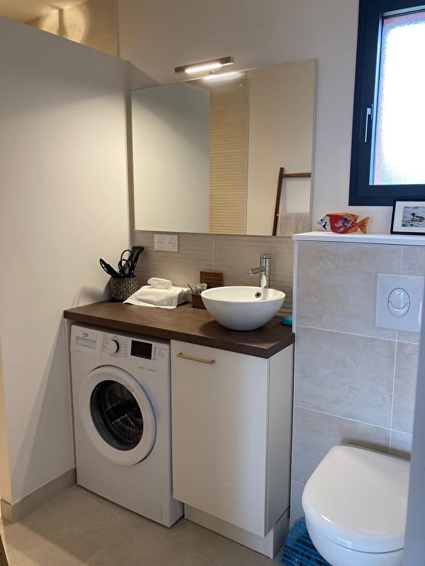 - 1 salle d’eau avec une grande douche à l’italienne (120 x 90 cm), un lave-linge, un wc, un chauffe-serviettes soufflant, un sèche-cheveux. Le gel douche est fourni.