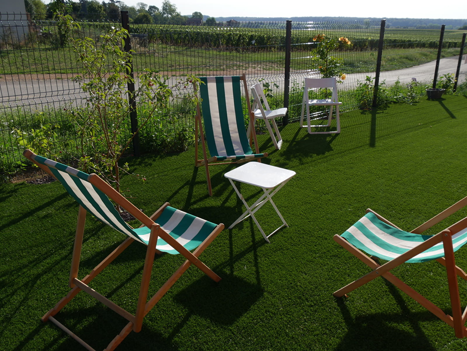 A l'extérieur, dans le jardin , les voyageurs peuvent prendre leurs repas sur une table et deux chaises à leur disposition et se reposer sur des transat face aux vignes.