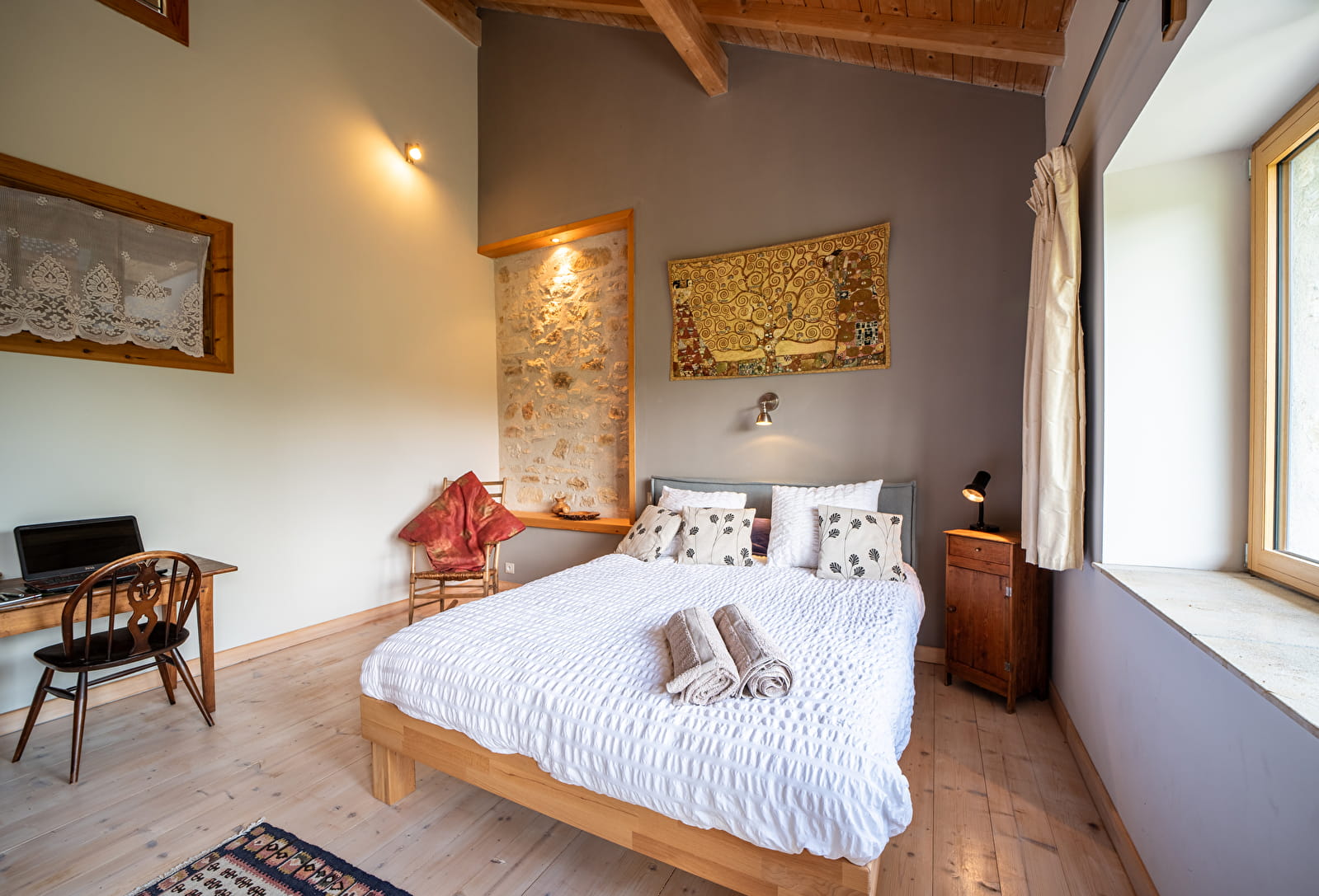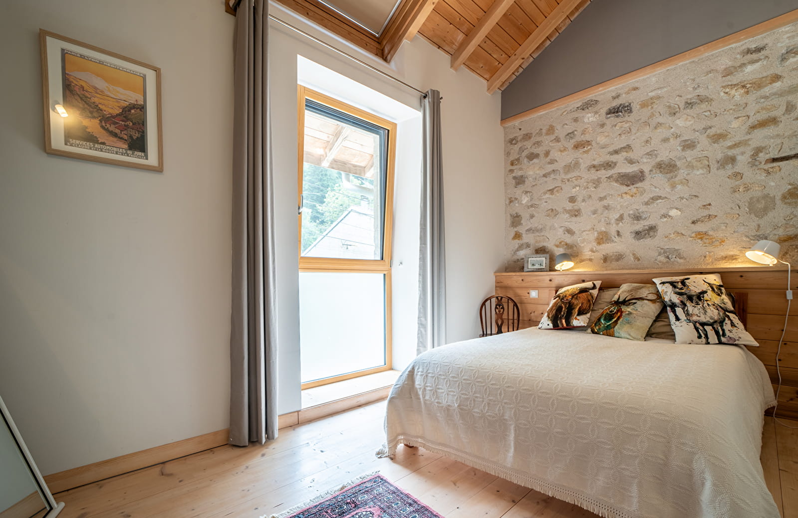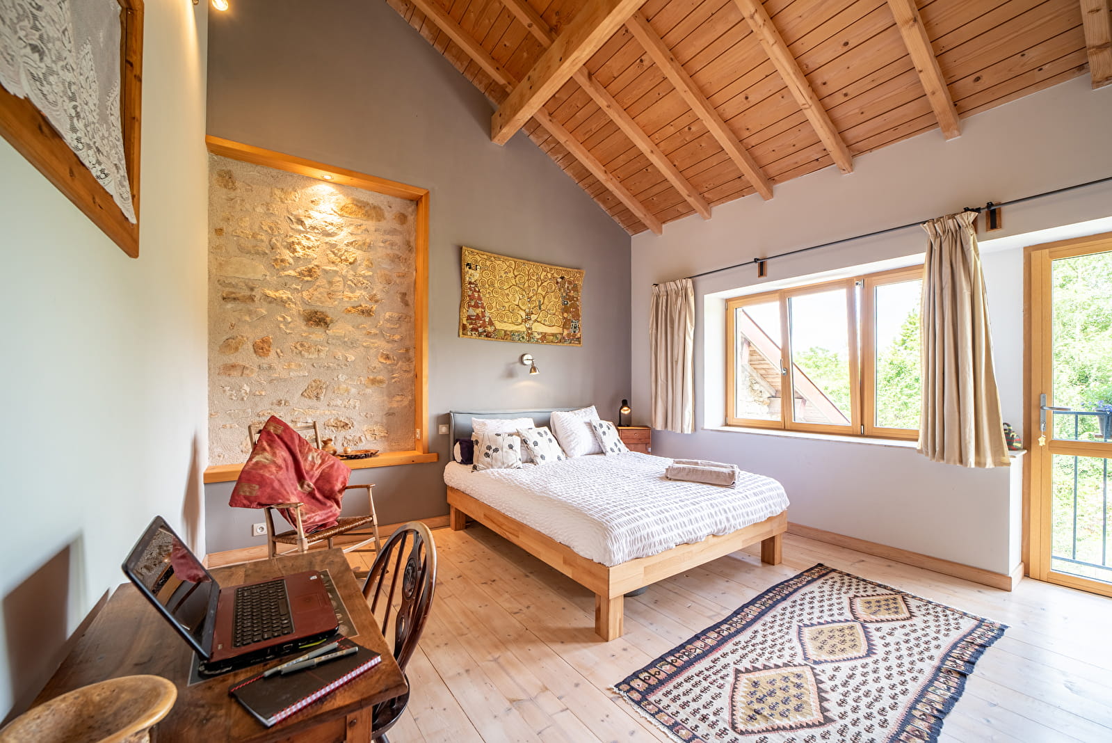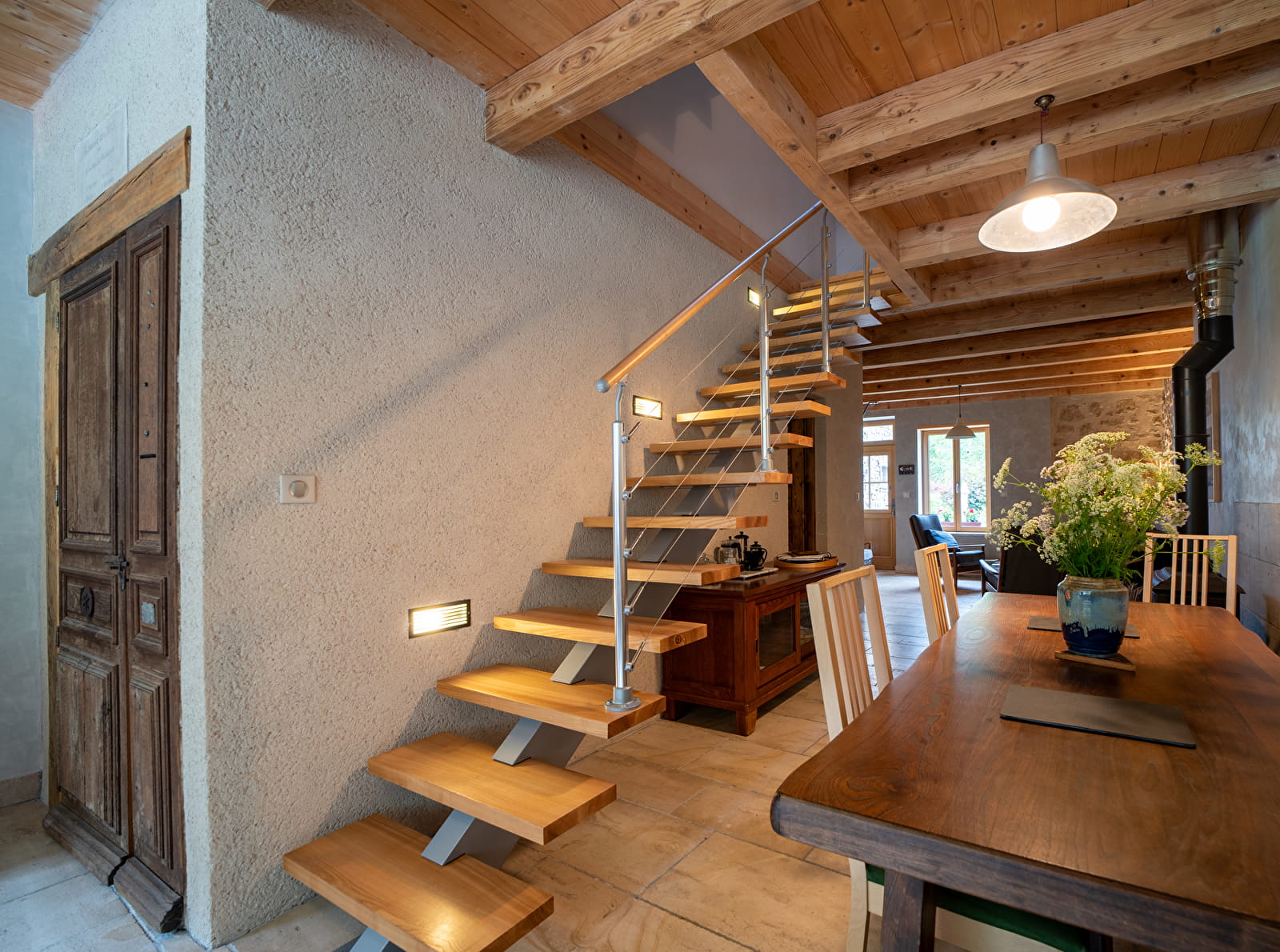 Au coeur du Pays des Lacs dans le Parc Naturel Régional du Haut-Jura, cet ancien atelier de tournerie d’une superficie de 120m2 a été rénové et transformé en gîte de trois étages disposant de trois chambres spacieuses. Le charme de l'ancien se marie avec le confort du moderne, utilisant le bois, la pierre et la chaux dans les pièces de grand volume. Respectueux de l’environnement, la peinture écologique est à base d’argile et respirante, la maison est équipée d’une pompe à chaleur et le poêle brûle du bois provenant des forêts qui nous entourent. Situé dans un hameau paisible (sans issue pour la circulation), le gîte est entouré par la forêt dans un écrin de verdure où des sentiers de randonnée et de VTT passent devant la porte. A seulement 5 kms du Lac de Vouglans, les promenades à pied, à cheval ou sur l'eau s'offrent aux visiteurs, tandis que les commerces, le cinéma et le Musée du jouet se trouvent à moins de dix minutes. Un jardin clos privatif de 125m2 avec vue sur la campagne est à votre disposition. Un seul chien accepté avec accord préalable.