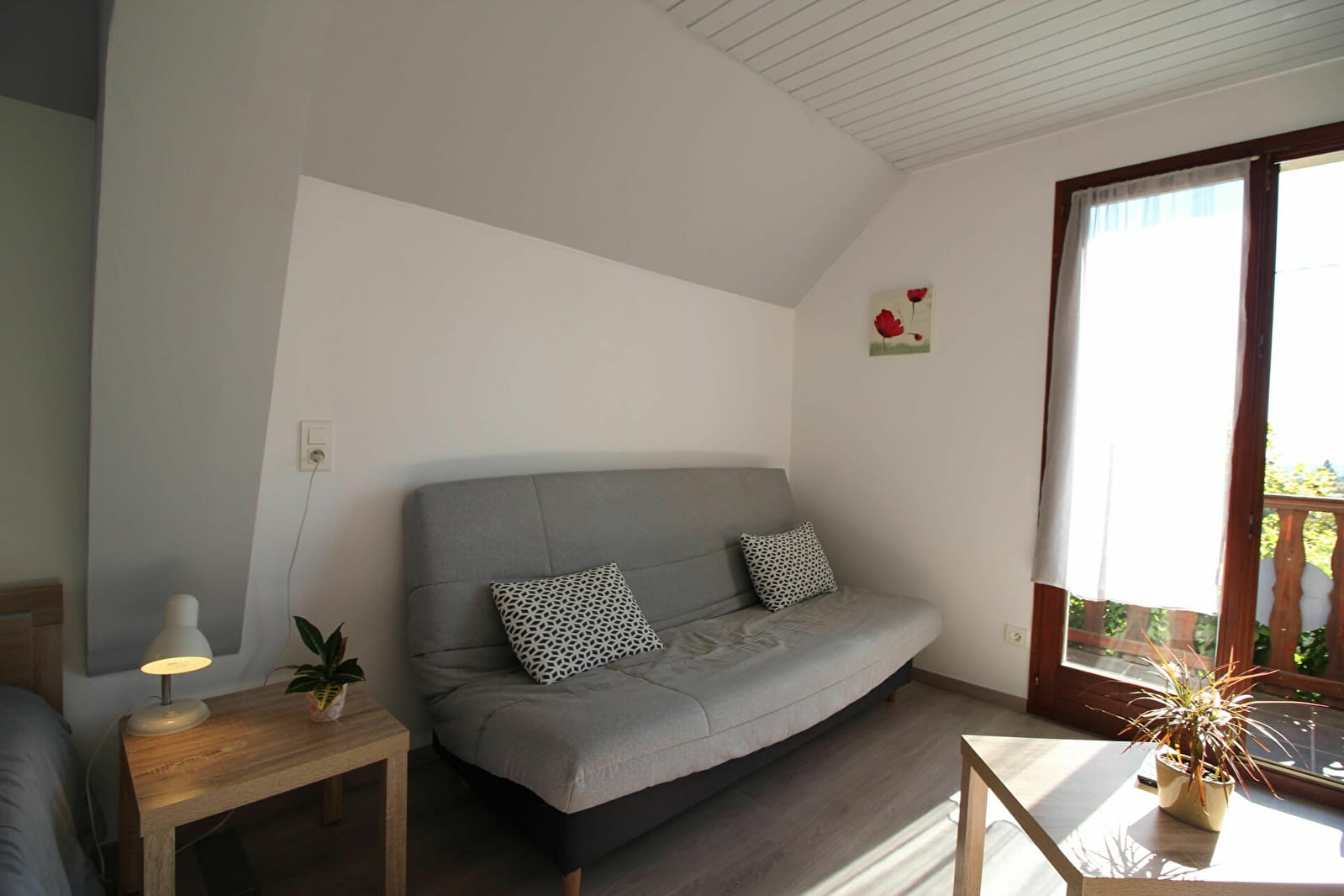 Gite indépendant, situé au calme, plein sud dans une propriété de 50 ares clos. Joliment arboré, à 500 mètres d'altitude au pied du ballon d'Alsace et à 5 minutes du centre-ville et des commerces.