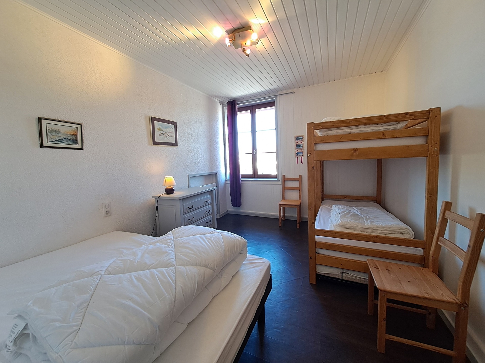 Situé dans la résidence "Le Bois de L’ours", cet appartement de 60m² au 1er étage est composé d’une entrée avec rangement, pièce principale avec coin cuisine/repas et coin salon avec canapé clic-clac en 140cm. Une chambre indépendante avec lit de 140cm et lits superposés en 90cm.