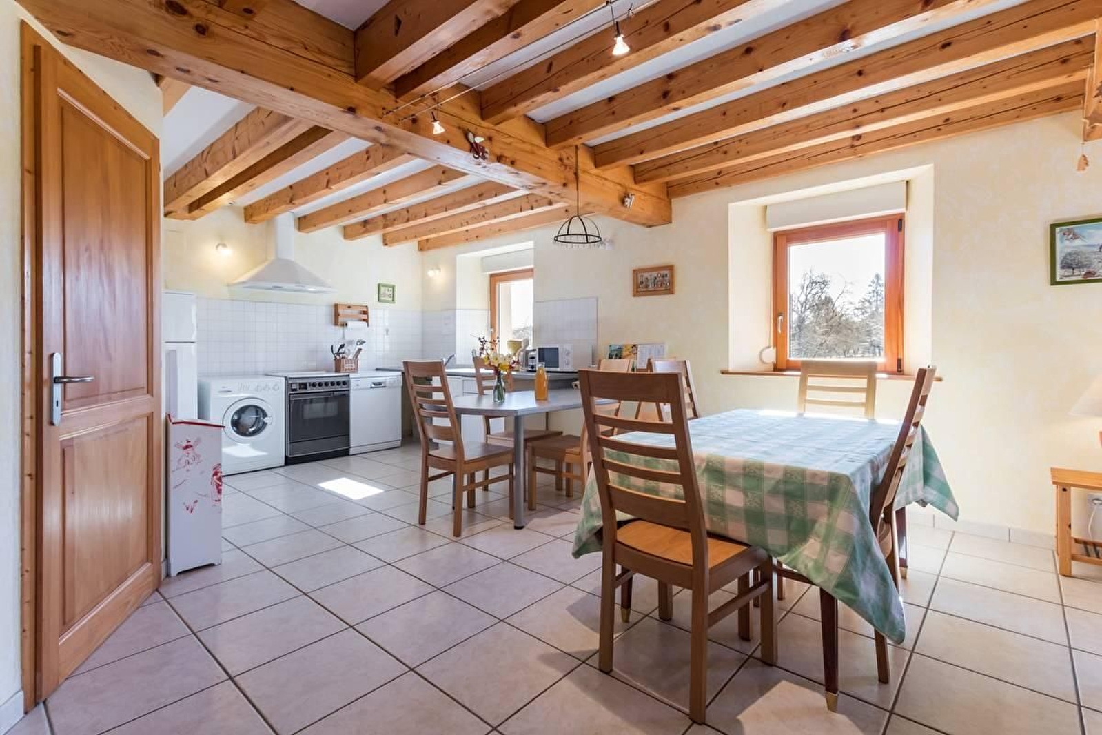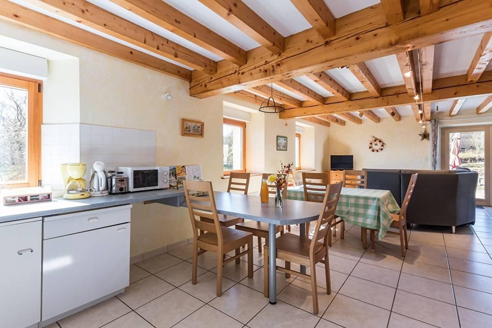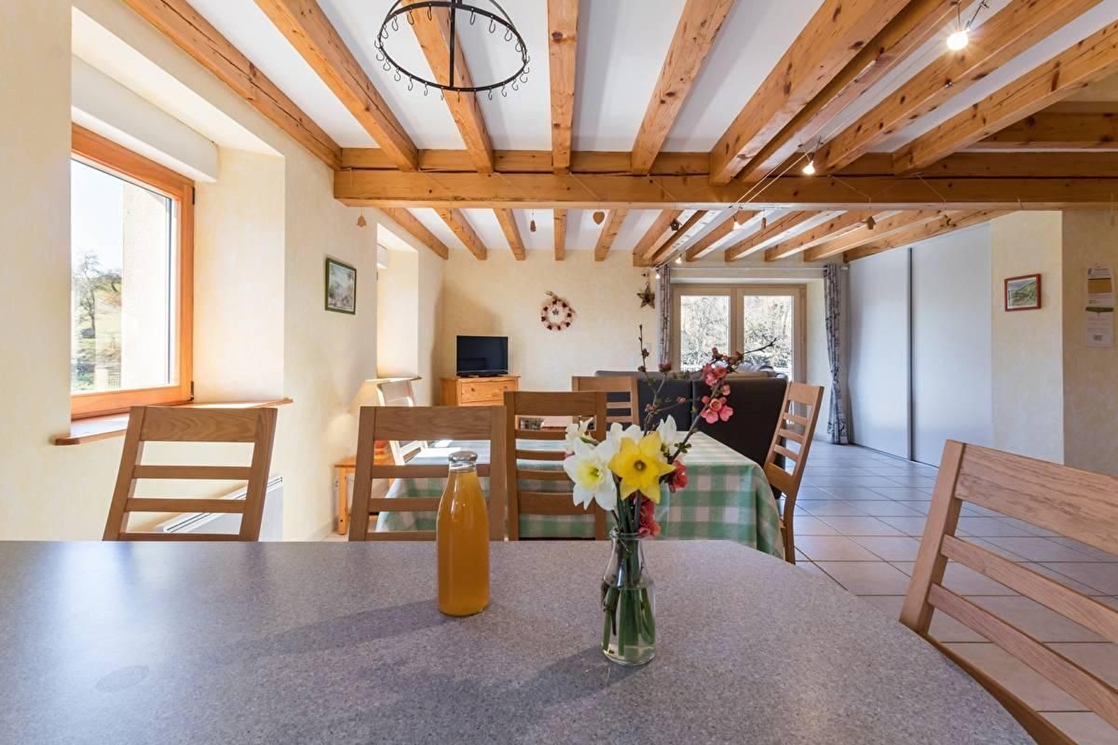 Le Borrauchî, gîte au calme, au cœur des Vosges Saônoises, entouré de vergers : nombreux pruniers, d'où son nom en patois : Borrauchî. Dans un petit hameau à 2,5 km du bourg, maison indépendante mitoyenne à un bâtiment agricole (sans nuisance) et comprenant au rez-de-chaussée surélevé : entrée, grand séjour/ cuisine/salon avec canapé, salle d'eau, WC. Au premier étage : 1 chambre (lit 2 personnes), 1 chambre (1 lit 2 personnes - 1 lit bébé), 1 chambre de 9-10 m2 (2 lits 1 personne), une pièce avec WC, lavabo, table à langer. Internet WIFI. Jean, agriculteur, pourra vous faire découvrir son métier. Terrain privatif non clos donnant sur le verger. Portique. Grande terrasse (36 m²) accessible de plain-pied depuis le séjour.