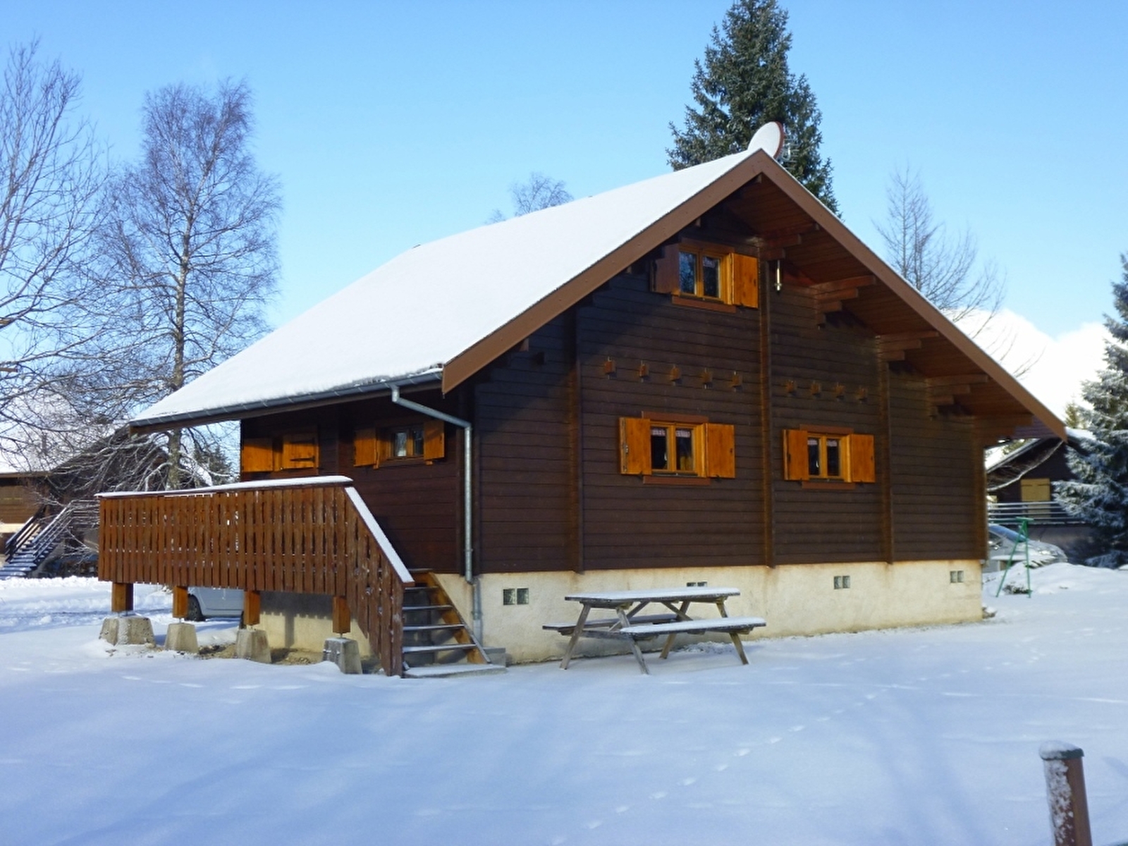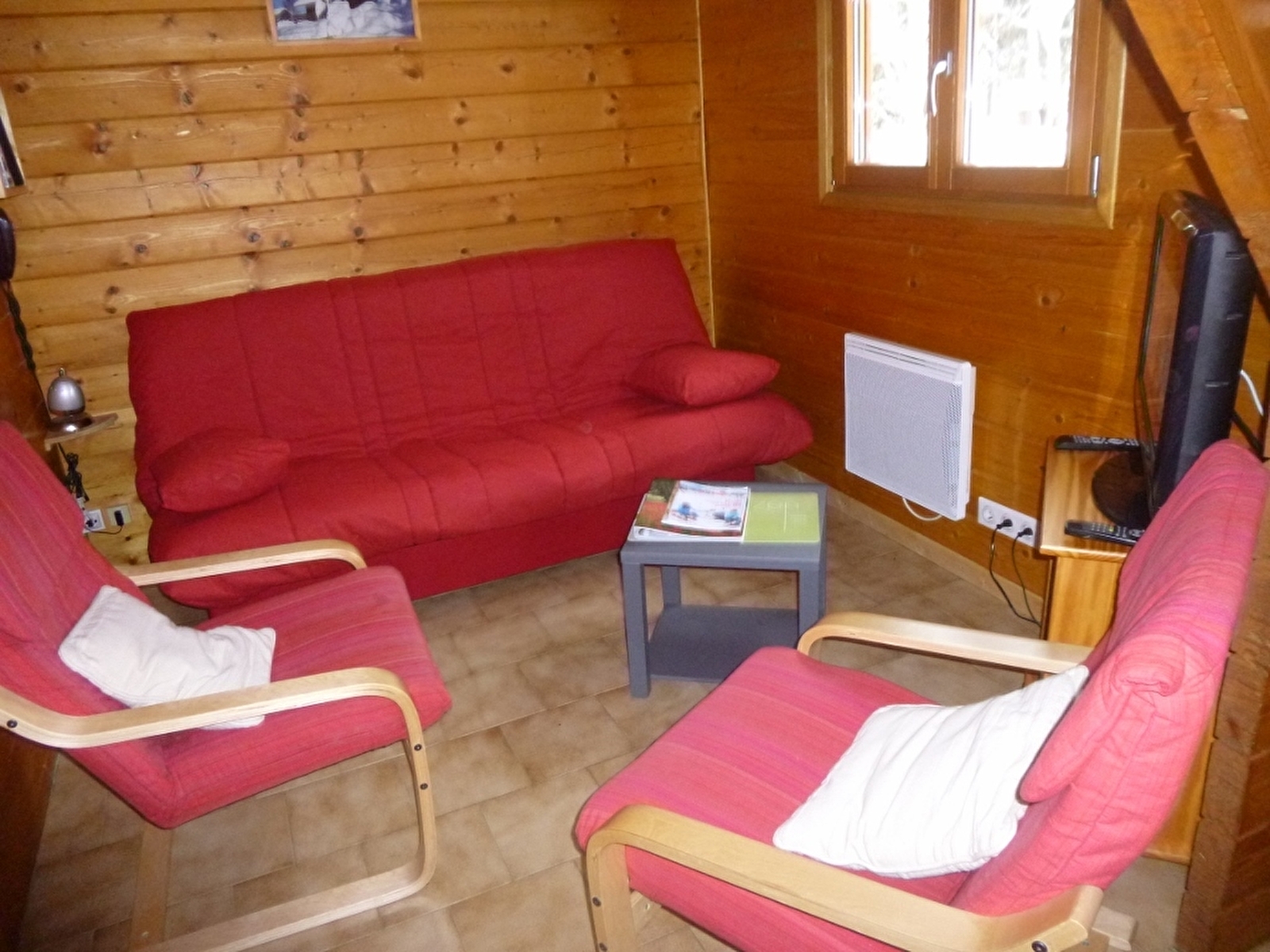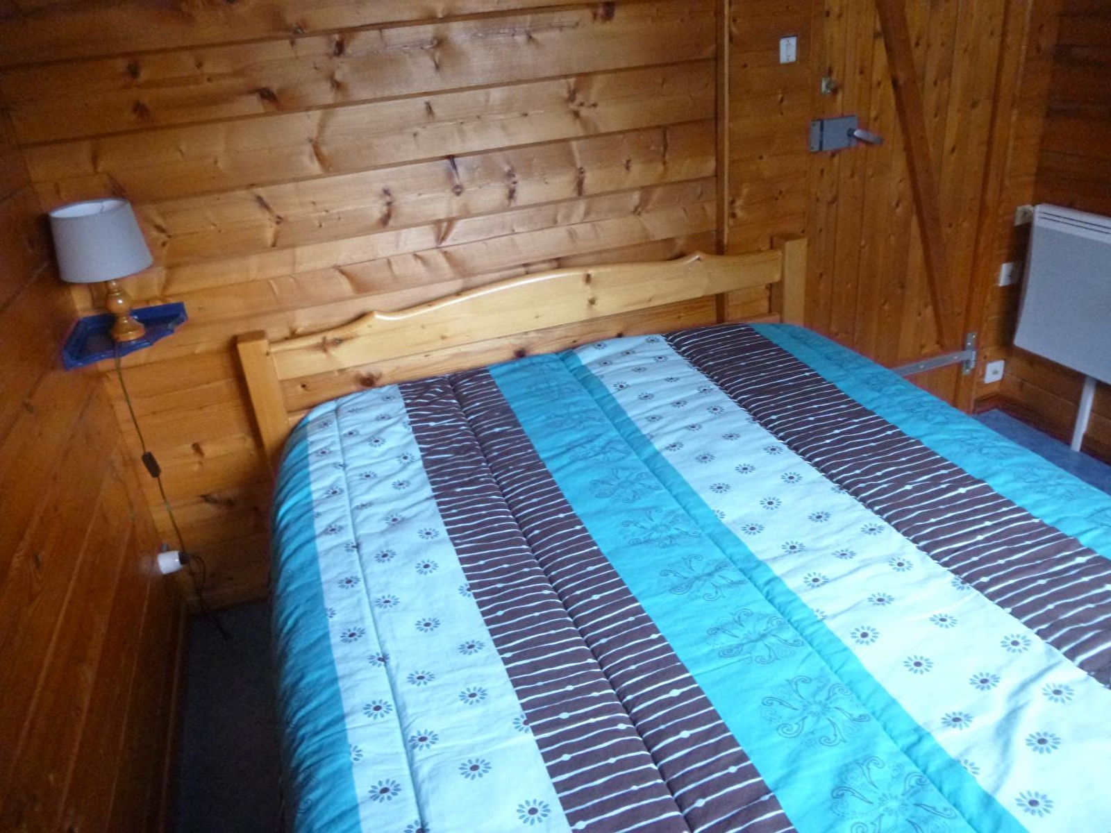 Chalet indépendant, avec au rez de chaussée: séjour, salon, coin cuisine, salle d'eau avec WC, une chambre avec un lit 2 places. A l'étage: une mezzanine, et 2 coins nuit pour 1 personne, terrain attenant non clos, cour, balcon, barbecue, salon de jardin. Chauffage électrique. Toutes charges comprises. Table de pique-nique, parking privatif sur place.