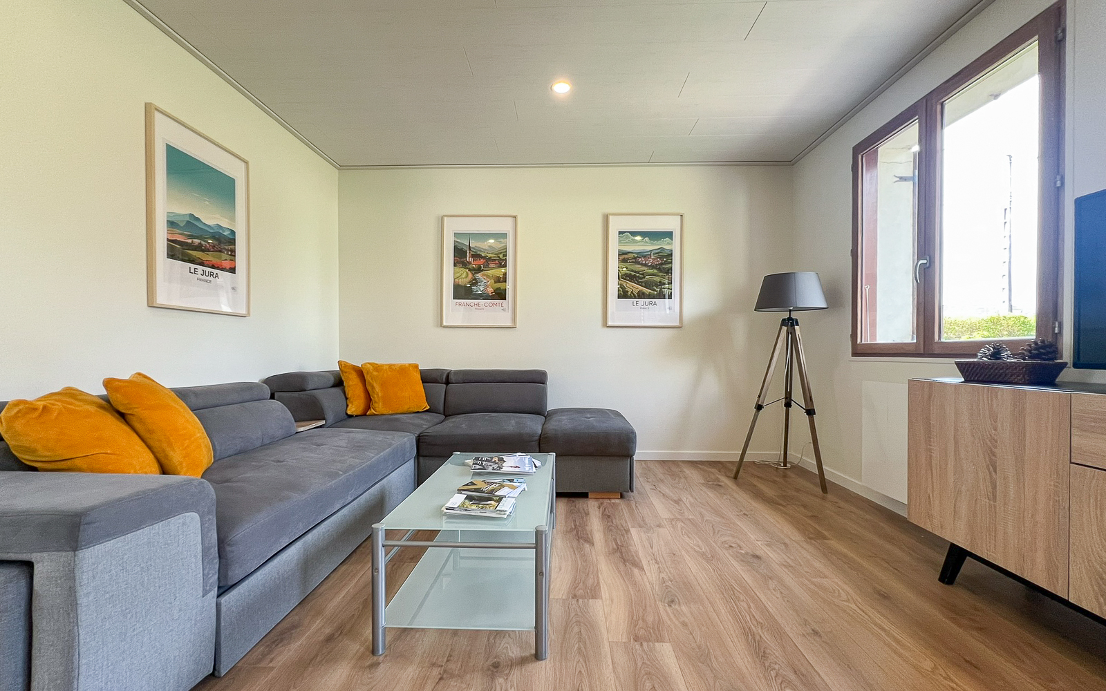 Au RDC (accès de plain-pied) : entrée, séjour/salle à manger, cuisine équipée ouverte, chambre (1 lit double) salle de bain (douche et WC), buanderie, salle de jeux avec baby foot.