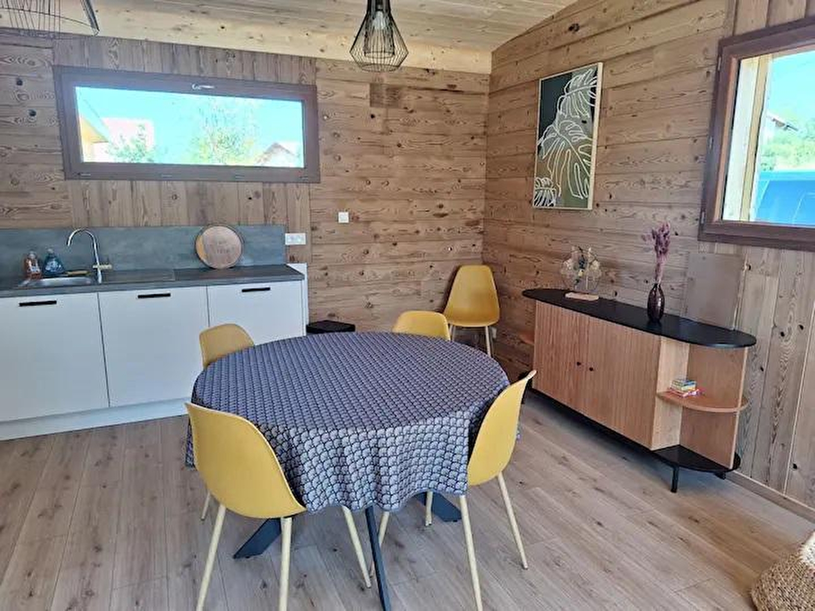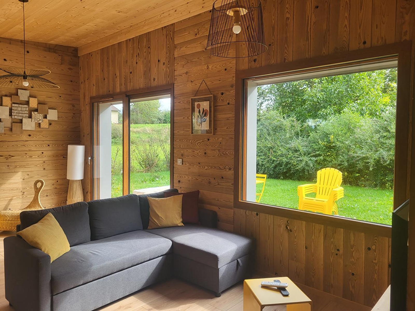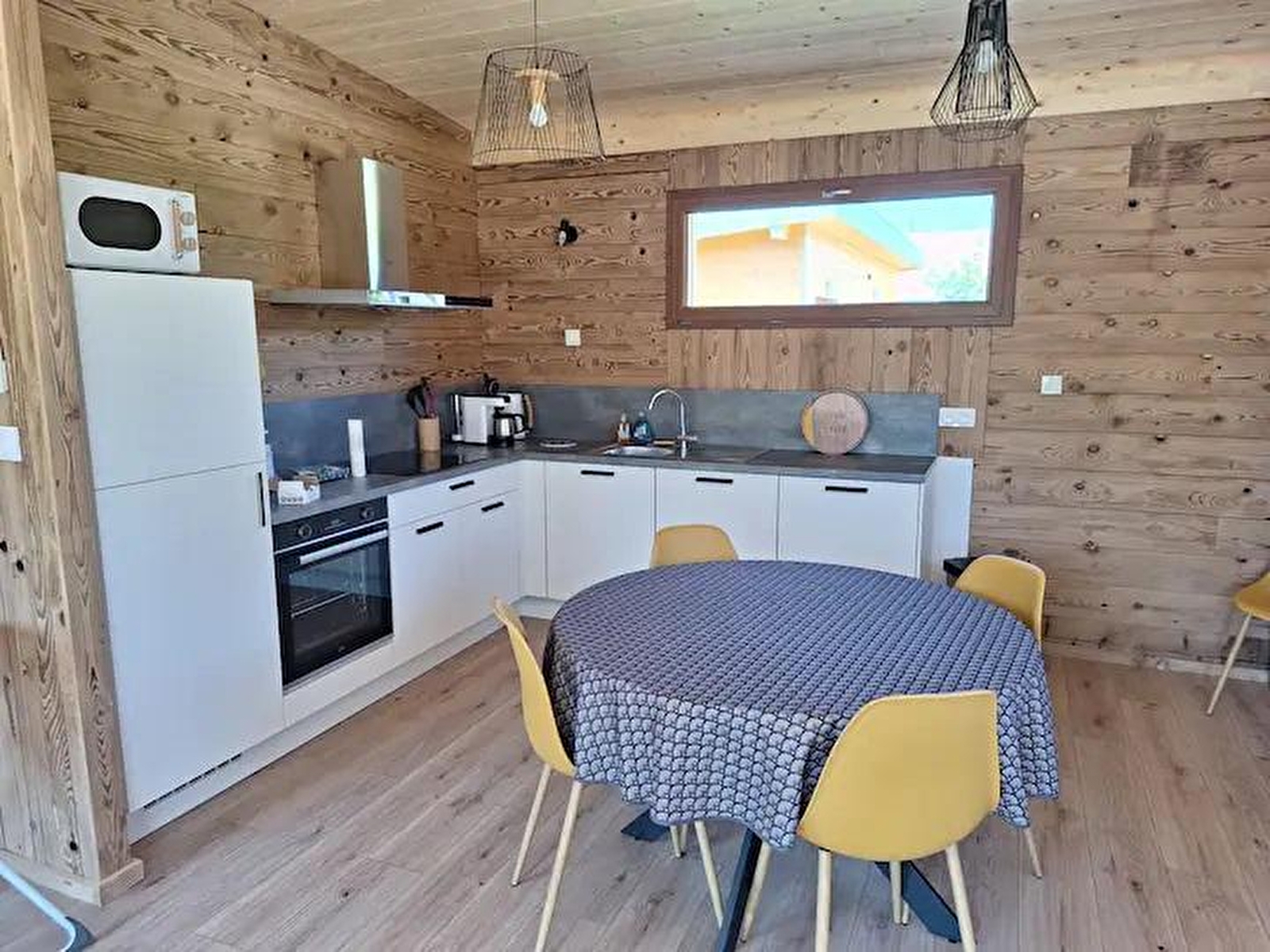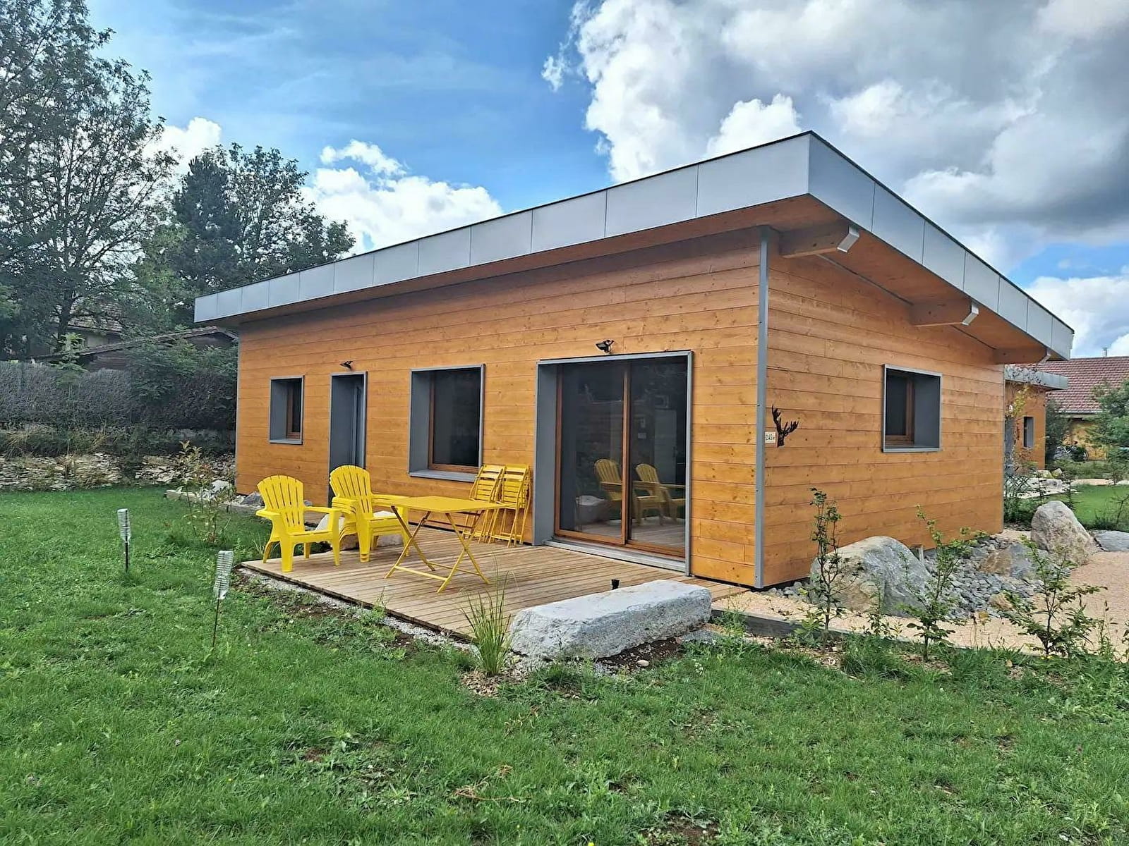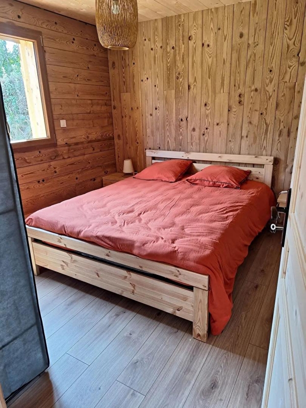 Cette maison neuve à ossature bois, de plain-pied, située à proximité du Pays des Lacs se compose d'une pièce de vie avec cuisine toute équipée, d'un coin salon avec TV, d'une chambre avec un lit double (160*200), d'une chambre avec 2 lits simples (90*200), d'un WC indépendant et d'une salle d'eau avec douche. Côté extérieur, vous pourrez profiter des beaux jours sur la terrasse, équipée avec salon de jardin, transats et barbecue. Note : Au moment du départ, le chalet doit être propre et rangé, le lave vaisselle doit être vidé, la vaisselle rangée, le gite doit impérativement être balayé avant le départ et le nettoyage du coin cuisine est impératif avec ou sans forfait ménage. Une caution de 30 euros pour le nettoyage du coin cuisine vous sera demandée. ATTENTION : les prises de courant ne sont pas aux normes pour la charge des véhicules électriques. Il est formellement interdit de s'en servir pour une telle utilisation. Risque de court circuit ou d'incendie. Une borne de recharge rapide est disponible à 200 m (nous contacter) Un autre gite est situé à côté de celui ci pour 4 personnes également. ils peuvent être réservable en commun. Parking privé sur place et volets dans les chambres.