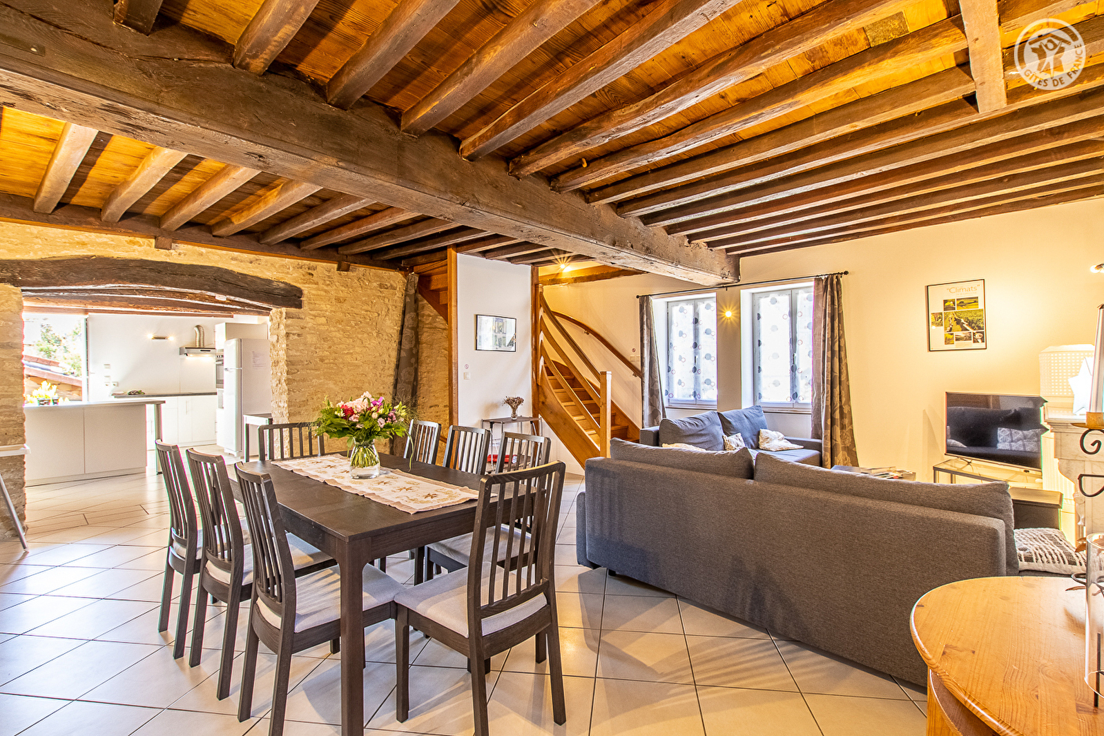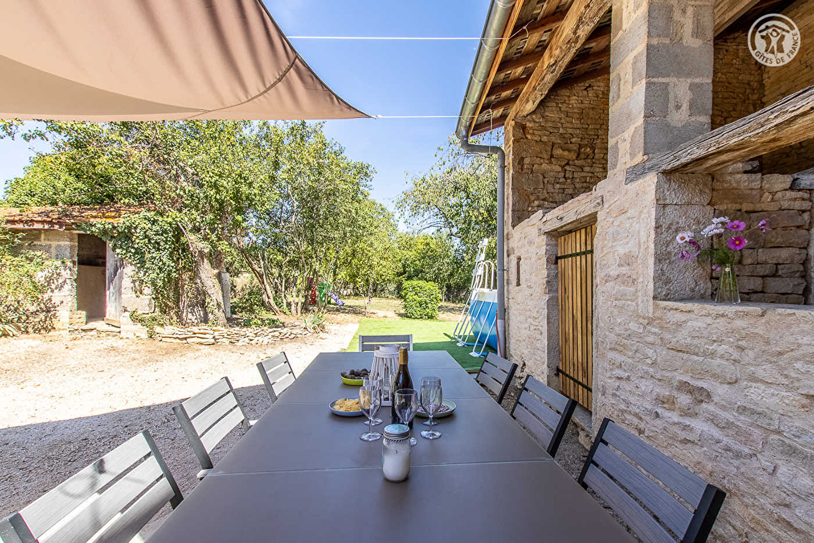 Belges d'origine & bourguignons d'adoption, Isabelle & Étienne vous accueillent au sein d'une ravissante demeure de pays de caractère du XIXe pétrie d'histoire (ancienne maison de vignerons) & restaurée avec soins, lovée au calme en bordure d'une paisible ruelle & lisière de prairie. Au cœur d'un pittoresque petit village, à deux pas d'une bucolique place-square arborée, épicentre du bourg où se disputent de conviviales parties de pétanque à l'ombre des platanes ! En pleine campagne vallonnée (en partie protégée en "Zone Natura 2000" pour son riche écosystème), blotti sous les collines boisées du massif Sud Bourgogne (vaste massif forestier sauvage à parcourir lors de relaxantes balades à pied ou VTT), tout proche des premiers vignobles, au creux d'un apaisant écrin préservé, entre champs, vignobles, forêts & prairies. Somptueux panoramas & paysages à découvrir aux alentours. Gîte de bon confort. Ultra spacieux. Chaleureux cachet campagnard contemporain mixant traditions & modernité, allié à une restauration patrimoniale soignée (murs en pierres, plafonds à la française, charpente et poutres d'origine). Large terrasse sur cour dotée d'une confortable cuisine d'été (abritée & "tempérée" dans une historique dépendance). Agréable intimiste jardin arboré (figuier, prunier, cerisier, espace aromatique ludique), disposant d'une belle piscine hors-sol chauffée (3x5m) & d'une superbe vue dégagée sur la campagne environnante.