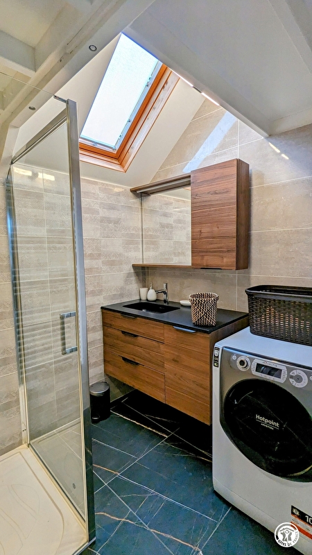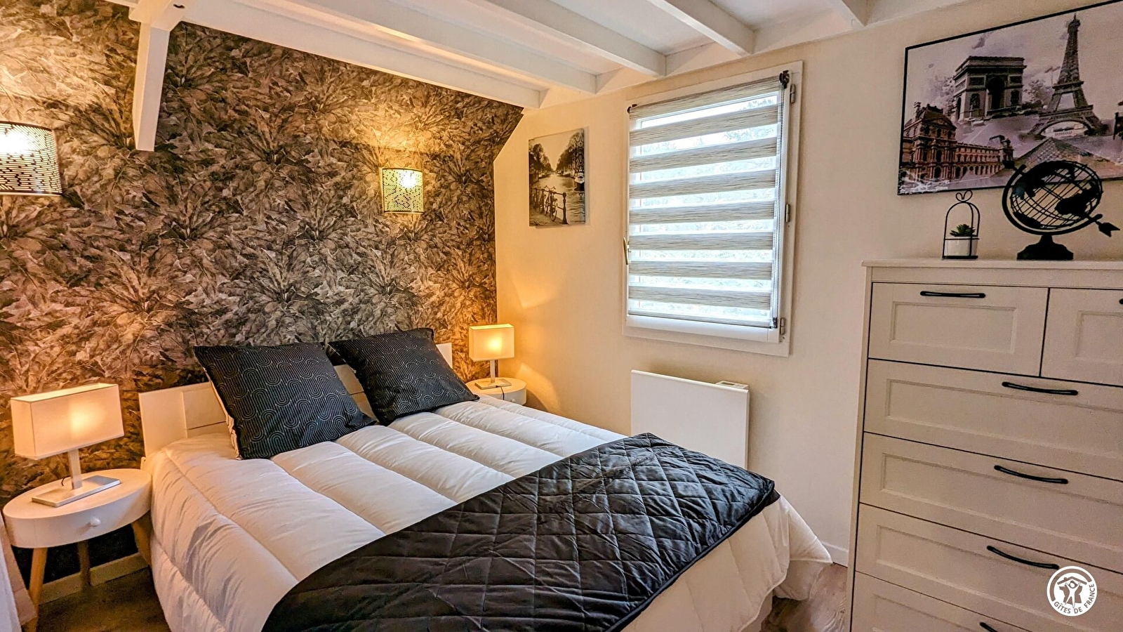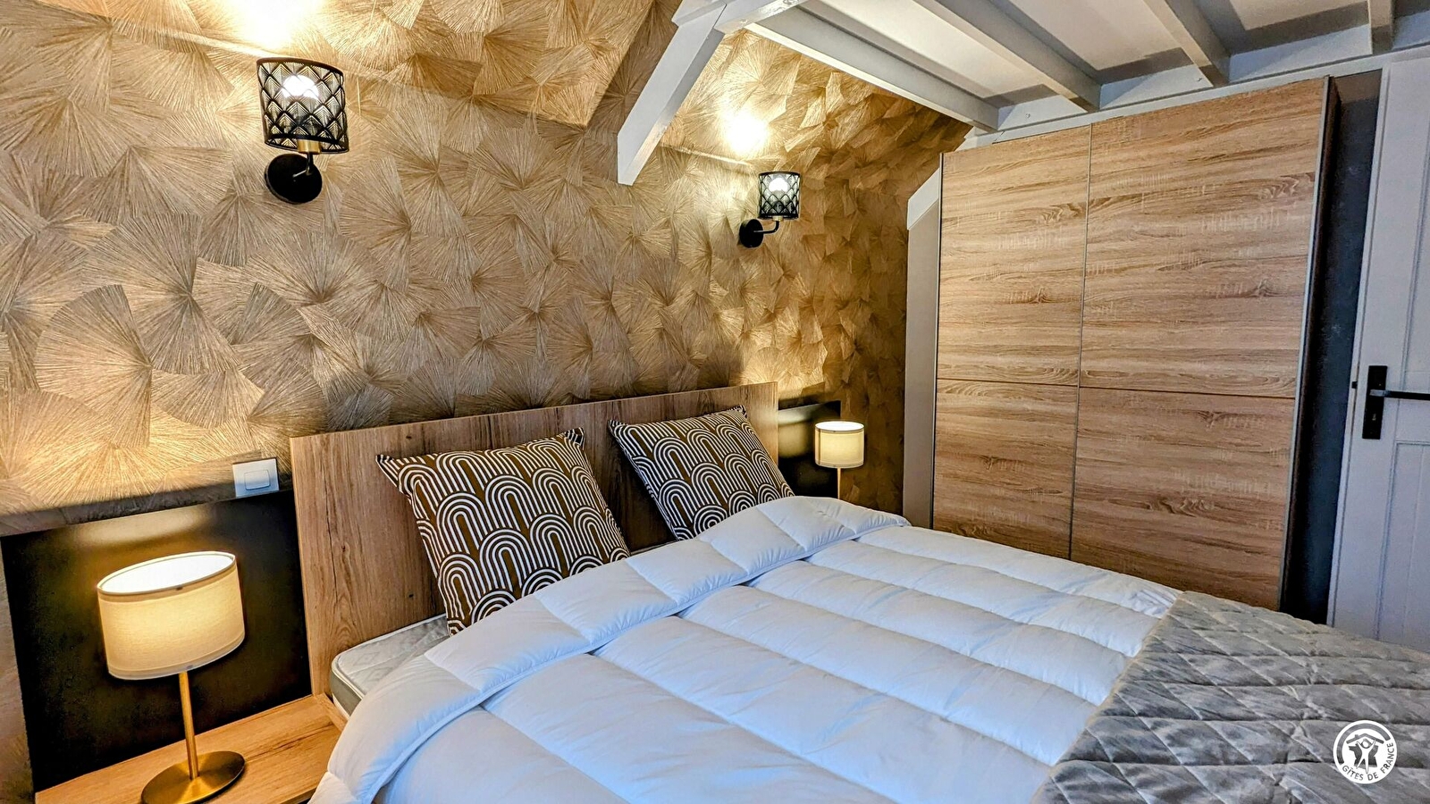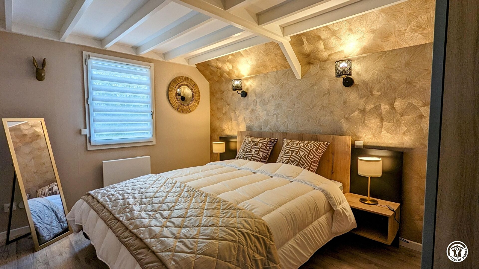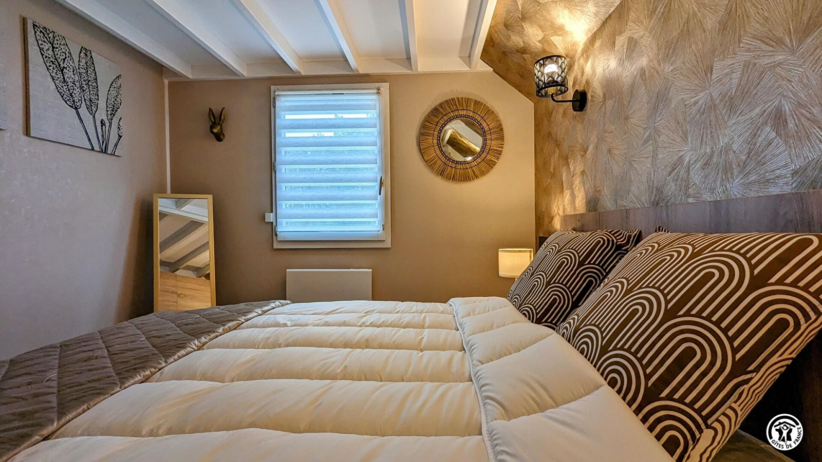 A l'étage, en mezzanine, 2 lits de 90 cm X 1,90 cm , espace idéal pour 1 ou 2 enfants. Gîte entièrement rénové à la décoration soignée.