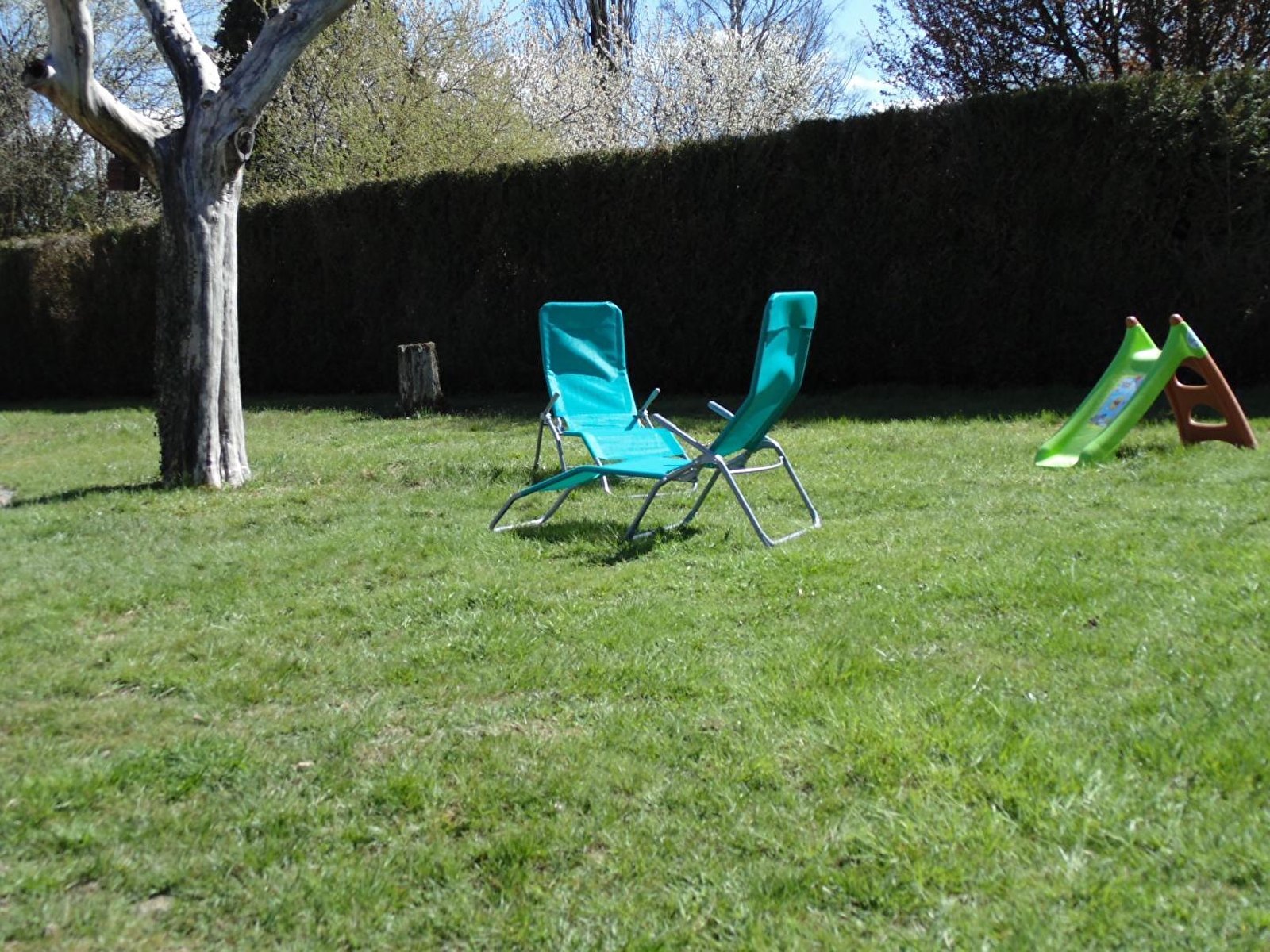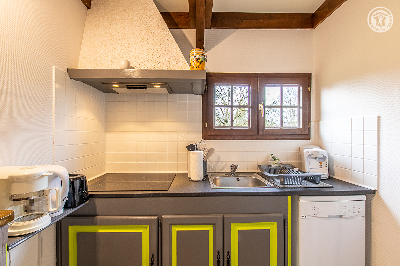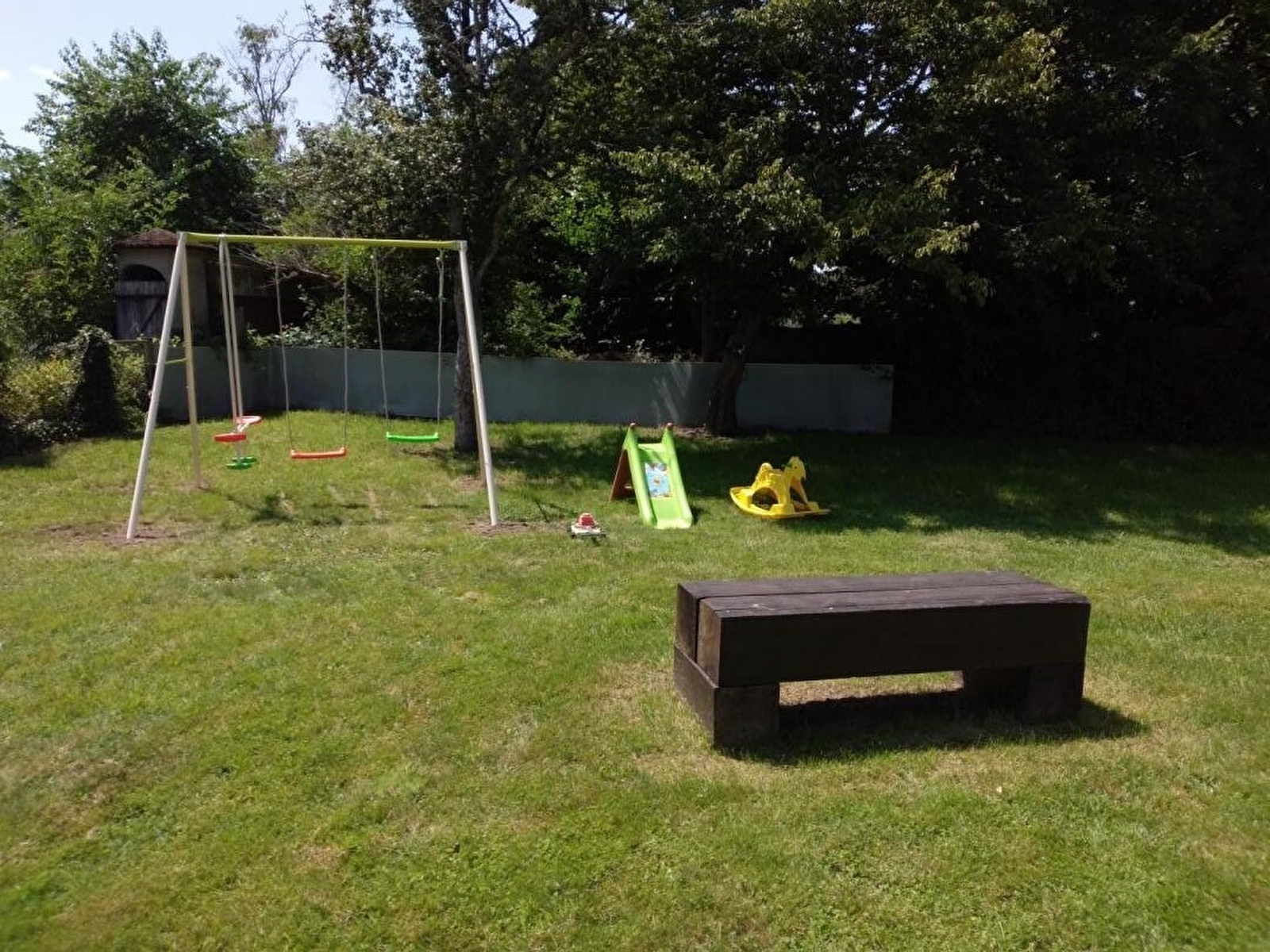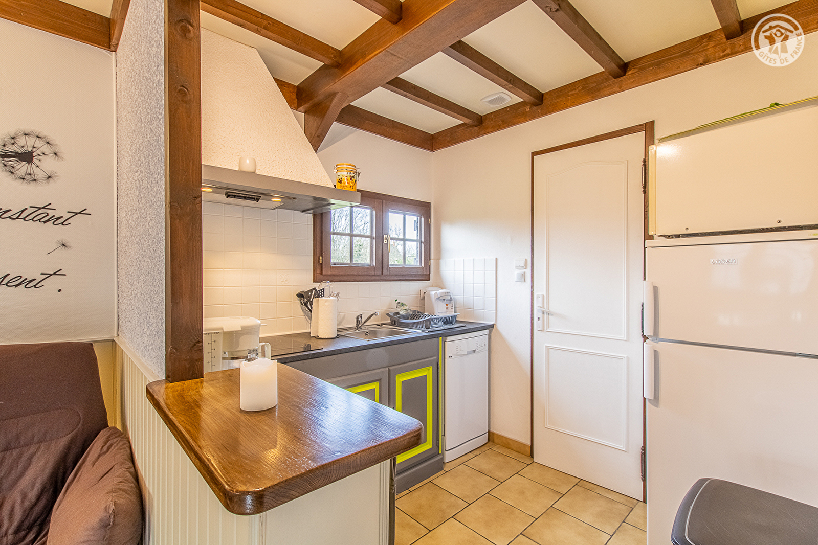 Composition : Maison individuelle (accès par 300m de chemin empierré carrossable). Gîte en rdc surélevé accessible par petit chemin/escalier montant à flanc de pelouse depuis parking. Wifi (fibre). Chauffage électrique. Séjour-cuisine-salon (2 lits 1 p. superposés 90x190cm), une chambre-cabine (lit 2 p. 140x190cm), salle d'eau (douche/wc), buanderie indépendante en sous-sol accessible par l'extérieur. Terrasse + jardin (800m² avec balançoire & toboggan) + local vélos + parking privés. Commerces & services 600m. Supermarché 2 km.