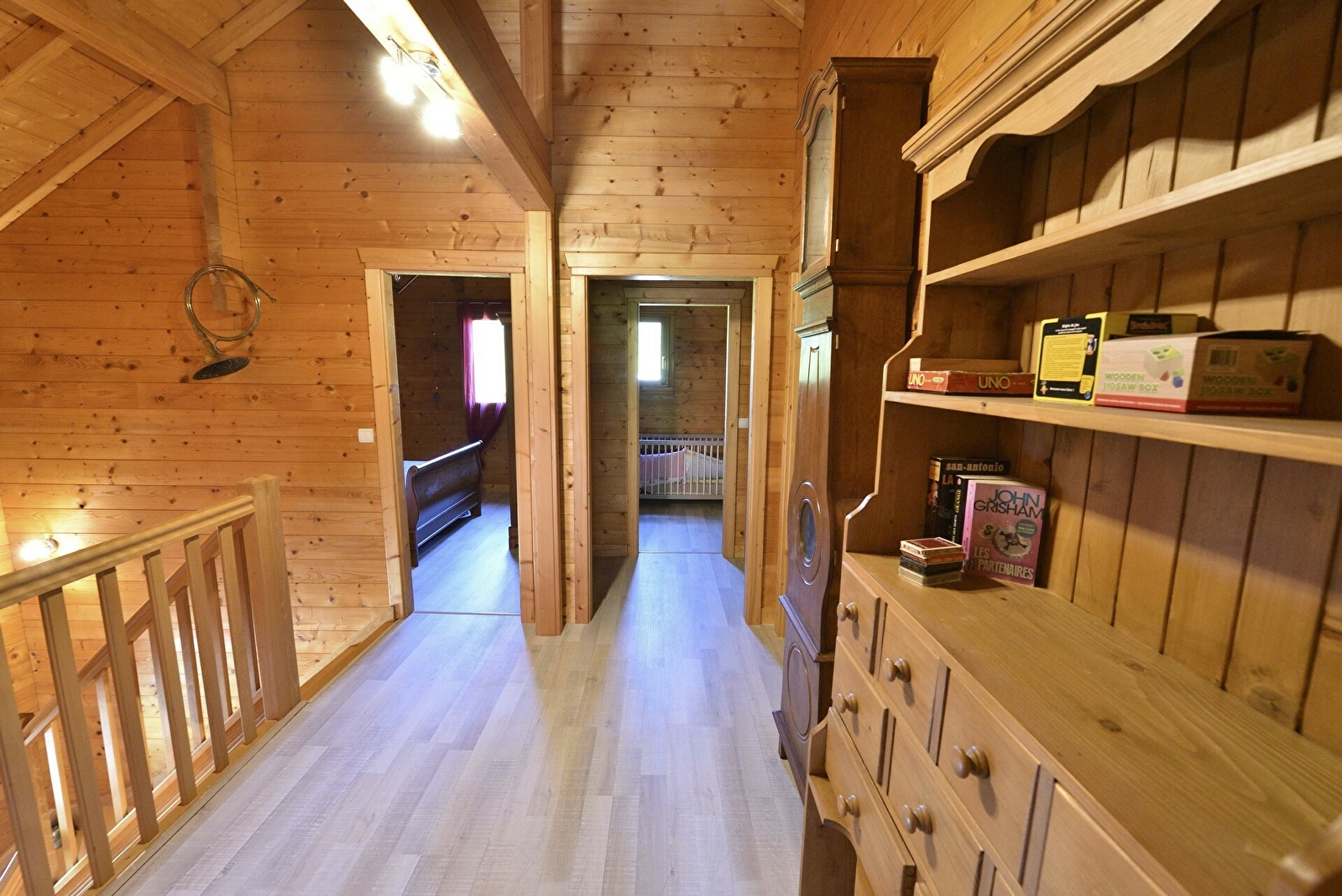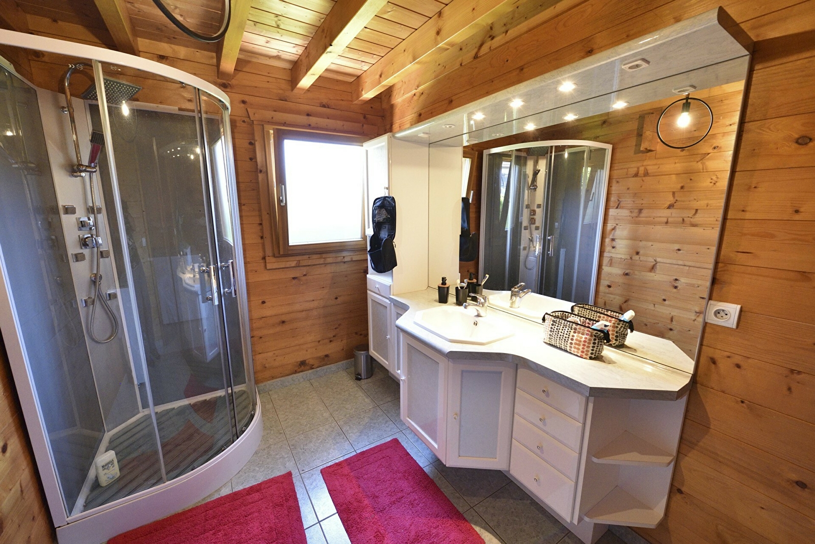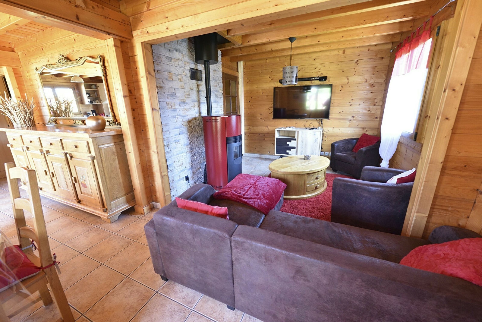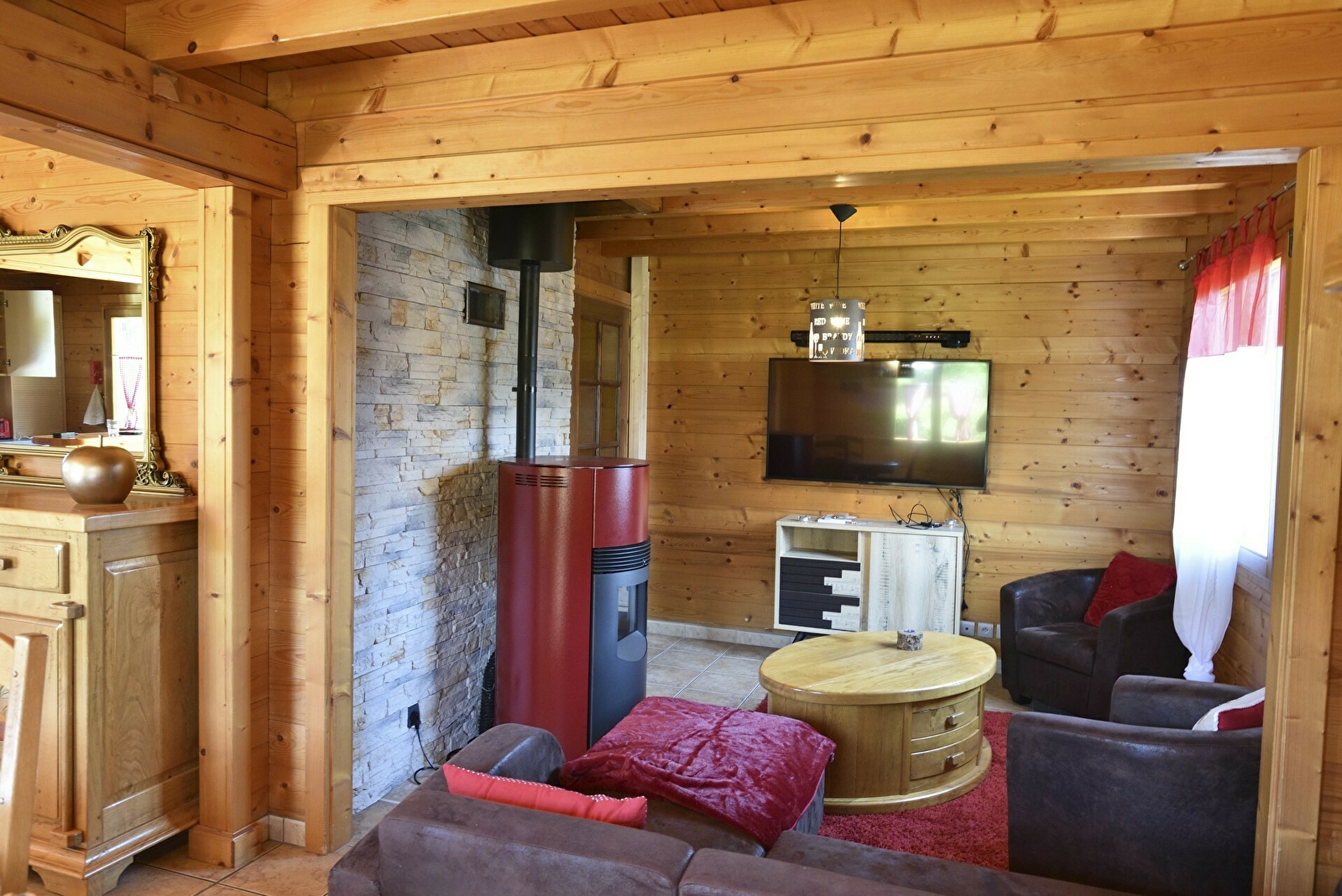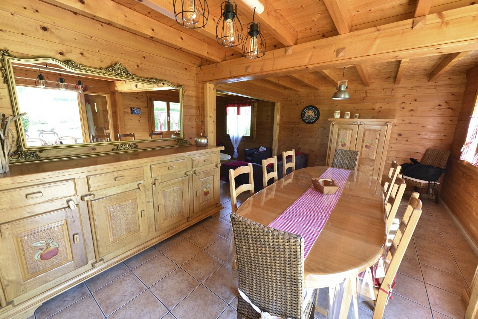 A l'extérieur : Le chalet sur un terrain de 1300 m2 sans vis-à-vis, superbe vu sur la campagne et le Mont Poupet, un abri pour voiture ou motos à votre disposition, une terrasse de 24m2 avec salon de jardin, barbecue, pergola, bains de soleil.