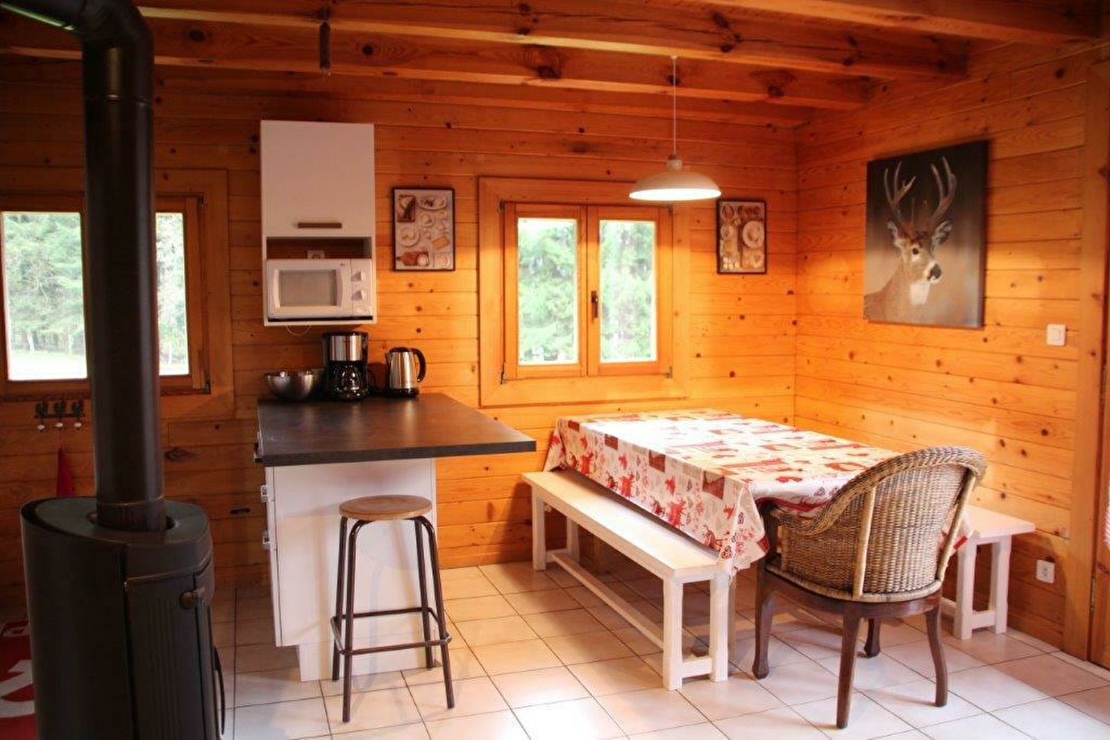 Le gîte est composé de 2 niveaux. Au 1er niveau : une cuisine entièrement équipée - 1 salon/salle-à-manger avec poêle à bois - 1 chambre avec grand lit (160 x 200) - 1 petite salle d'eau.