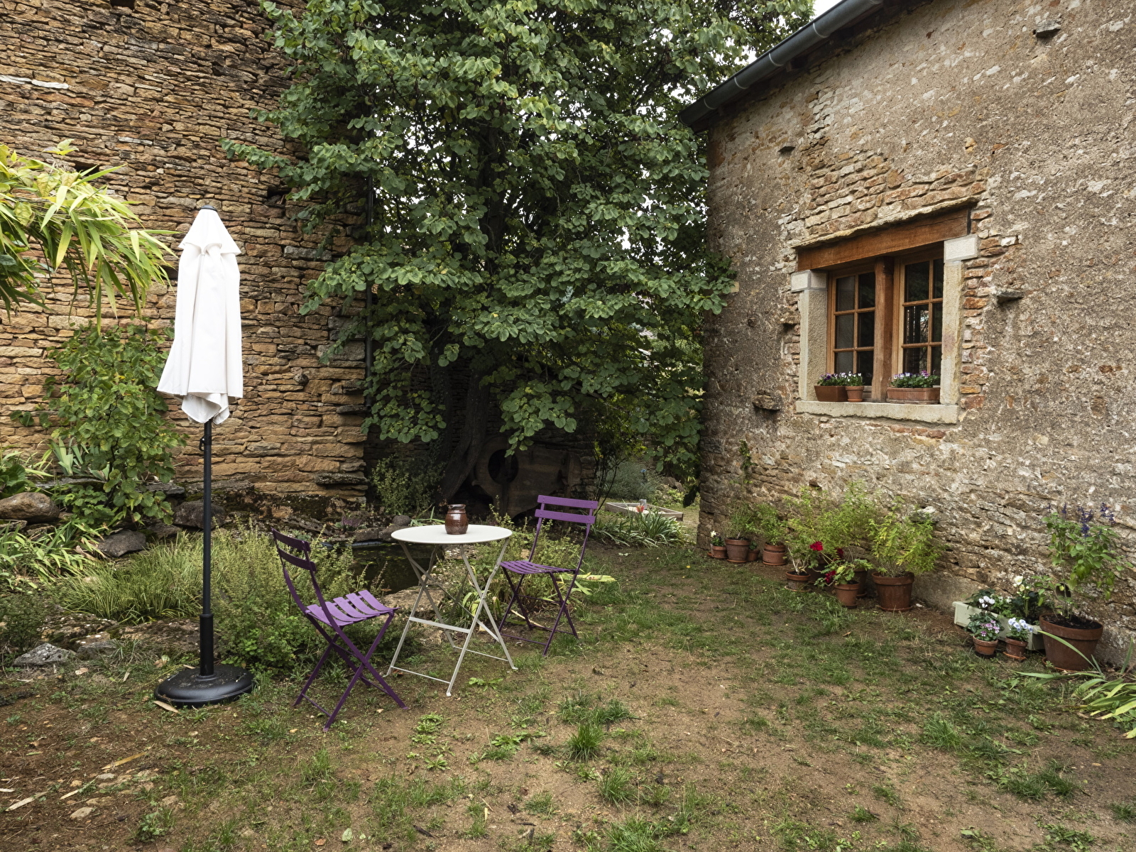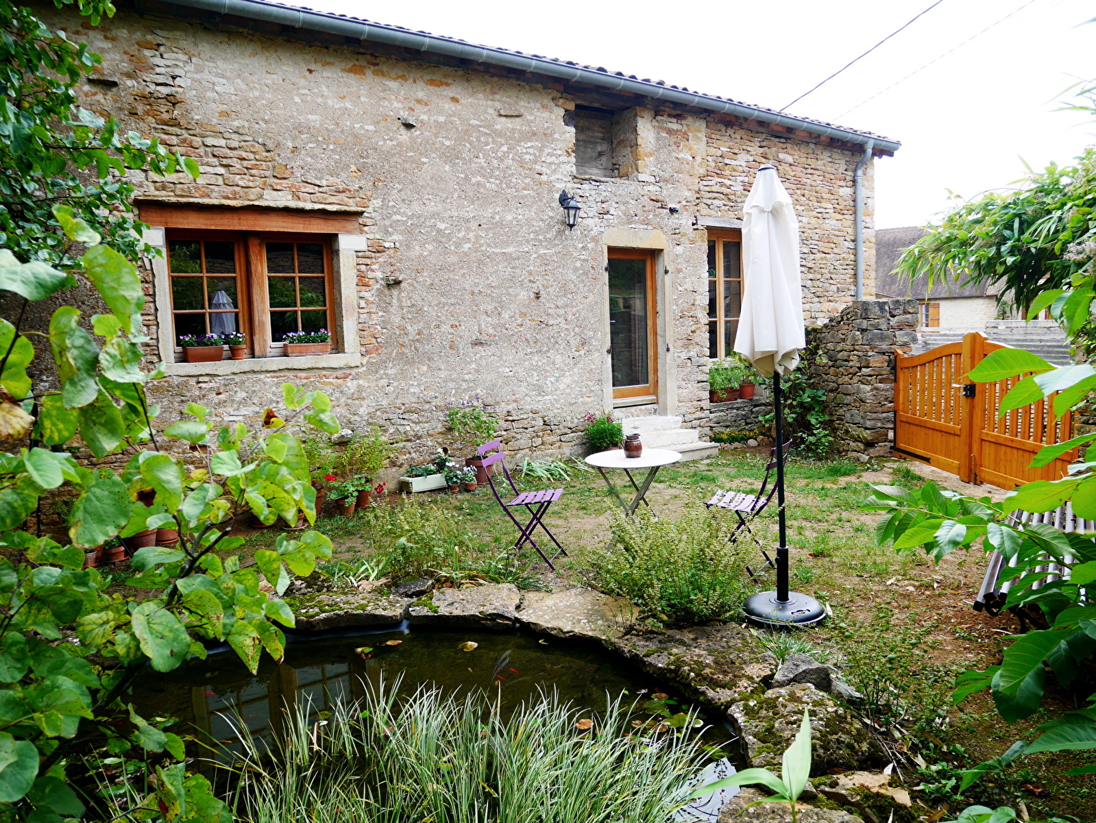 Le tout avec accès privé sur un petit jardin avec table ronde, banc en bois et le bassin aux poissons.