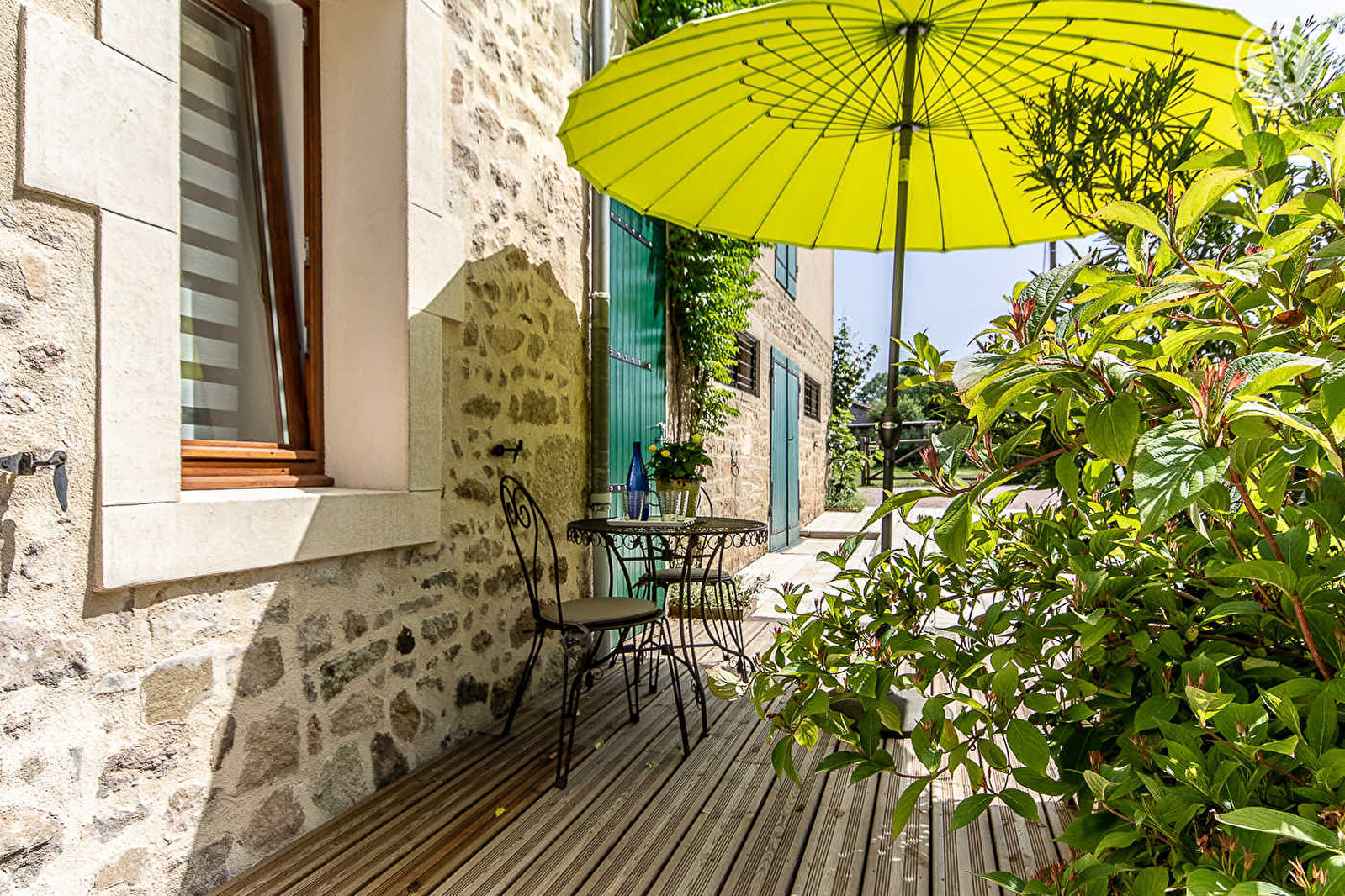 Bernadette vous accueille au sein d'un authentique corps de ferme de caractère du 19ème siècle - soigneusement restauré dans les règles de l'art - jouxtant son habitation sise sur une propriété close particulièrement soignée, littéralement « tirée au cordeau » (arborée, végétalisée, engazonnée et très fleurie), en partie aménagée dans l'esprit d'une « micro ferme » hébergeant de nombreux animaux parqués sans nuisance (poules, oies, deux ânesses…), dotée d'une production de miel « maison » (à déguster !). Véritable coin de paradis pour petits & grands ! Paisible petit hameau résidentiel, calme et très tranquille, lové au creux d'un ravissant écrin préservé de nature & verdure, en lisière de bocage et de la vaste forêt domaniale de Planoise (comptant parmi les plus grandes de France), sur un plateau dominant la vallée du Mesvrin, charmante coulée verte serpentant au pied du massif d'Uchon (« la Perle du Morvan »). Magnifique cadre paysager vallonné de montagne douce alliant prairies, vallées verdoyantes et collines boisées. Splendide vue dégagée sur la campagne environnante. Paysages et panorama de toute beauté. Spacieux gîte de très bon confort. Chaleureux cachet campagnard contemporain. Ambiance zen, douce et cosy. Équipement de qualité. Large terrasse exposée et ombragée (selon). Agréable jardinet privatif, aménagé et fleuri (disposant d'un second salon de jardin) & vaste propriété partagée en commun avec les propriétaires (notamment accessible pour visiter les animaux).