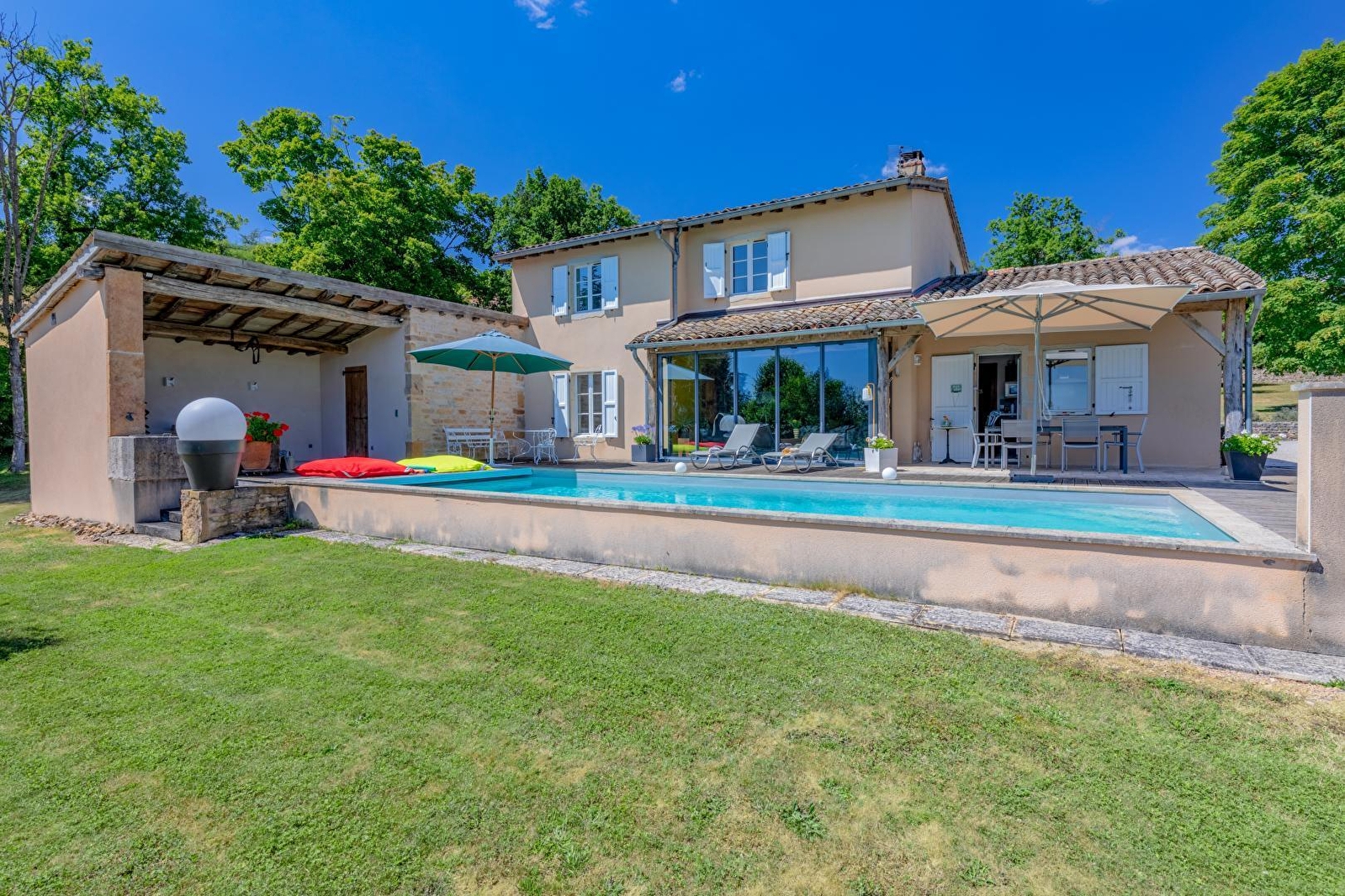 Ravissante villa contemporaine de pays édifiée dans les "nineties" (années 90) sublimée par d'authentiques matériaux traditionnels de caractère (poutres, tomettes, portes moulurées, charpente extérieur, appentis en pierres etc…), blottie à flanc de colline en "vigie" & "belvédère panoramique", sur un coteau sud-est exposé dominant l'illustre cité bourguignonne de renommée mondiale, "cœur spirituel" de l'Europe médiévale à l'inestimable patrimoine historique. Calme & tranquillité niché en bordure de ruelle & lisière d'une petite prairie boisée, au sein d'un paisible hameau résidentiel juché sur les hauteurs du bourg (qui abritait jadis des vignes), à deux pas de la douce campagne clunisoise préservée alentour, bucolique écrin champêtre & naturel vallonné, conjuguant prairies bocagères, vignobles, rivières & forêts sauvages. Spacieux gîte de grand confort. Élégant cachet campagnard aux accents contemporains, cossu & raffiné. Chaleureuse ambiance "enveloppante" digne d'un douillette "maison de famille". Énormément de charme & caractère. Équipement complet de qualité. Vaste terrasse exposée (complétée par une terrasse abritée) ouverte sur une belle piscine (10x4m), au creux d'une apaisante propriété engazonnée de 4500m² (quasi close avec portail électrique), soigneusement fleurie, végétalisée & arborée (cerisiers, amandier, pommiers, noisetiers, noyer… / cueillette possible), bordée de pittoresques murs en pierres sèches. Superbe vue dégagée sur Cluny & son abbaye et les monts du Clunysois. Magnifique panorama & paysages.