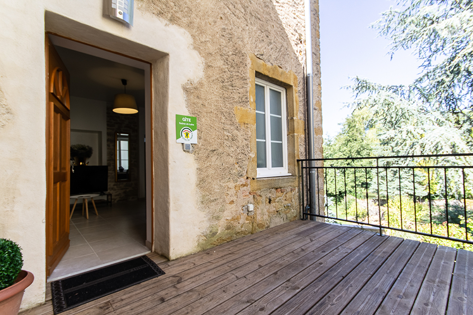 Composition : Petit immeuble comprenant également 2 logements et 2 commerces. Gîte totalement indépendant à l'arrière de la maison. Wifi. TV bouquet SFR. Chauffage électrique. Rdc surélevé. Séjour-cuisine-salon (canapé convertible 2 p. 140x190cm), chambre (lit 2 p. 160x200cm), salle d'eau (douche), wc indépendant. Jardin + balcon-terrasse + terrasse + parking privés. Commerces et service sur place. Gares TGV Mâcon & Creusot 50 km.