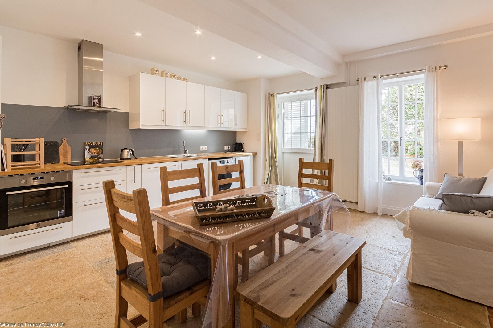 Sur les hauteurs de Dijon, dans un quartier calme et résidentiel, beau gîte aménagé au rez-de-chussée, mitoyen à la maison des propriétaires, dans une belle maison vigneronne du XIXème siècle : cuisine moderne équipée ouverte sur salon/salle à manger. 1 chambre avec 1 lit de 180 cm x 200 cm, 1 chambre enfant avec 2 lits de 90 cm superposés (+ un lit enfant jusqu'à 4 ans), 1 chambre avec 1 lit de 140 cm, donnant sur salle d'eau avec douche italienne, WC. Il faut passer par cette chambre pour accéder à la salle d'eau et aux WC. A l'arrière, grande terrasse privative, avec vue sur le jardin. Salon de jardin, transats. Hébergement tout compris : draps, ménage de fin de séjour, linge de cuisine et linge de toilette, chauffage, électricité. 1 lit bébé à disposition.