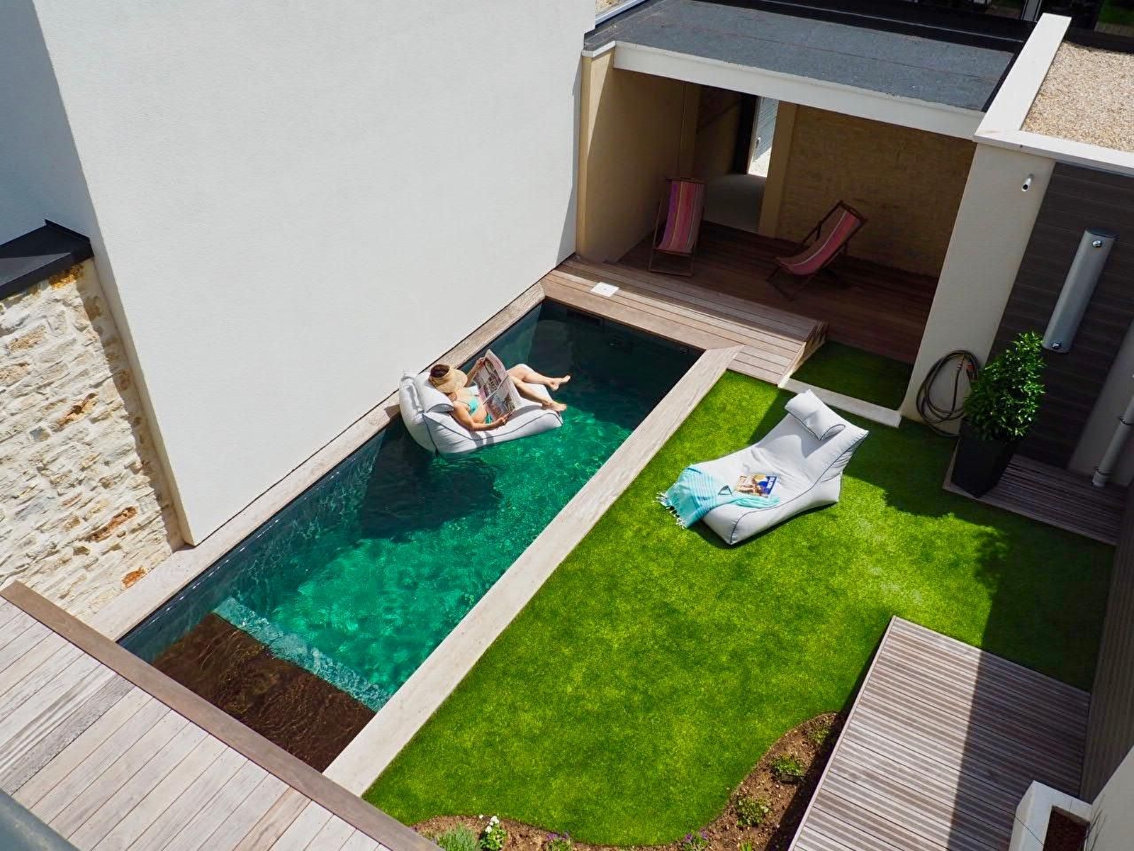 Extérieurs propices à la détente : 2 terrasses en bois et piscine privée de 5,5 x 2 m, ouverte de mai à septembre suivant la météo, avec abords en gazon synthétique. La piscine est chauffée et dispose d'un système de nage à contre-courant. Elle est sécurisée par un rideau automatique. Douche extérieure et WC indépendant dans local technique.