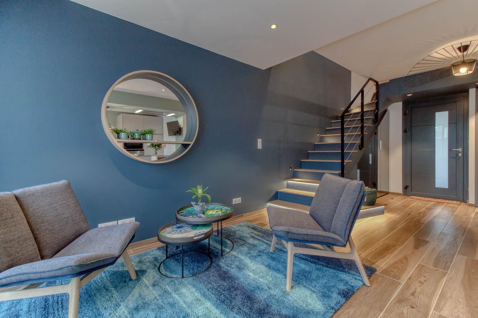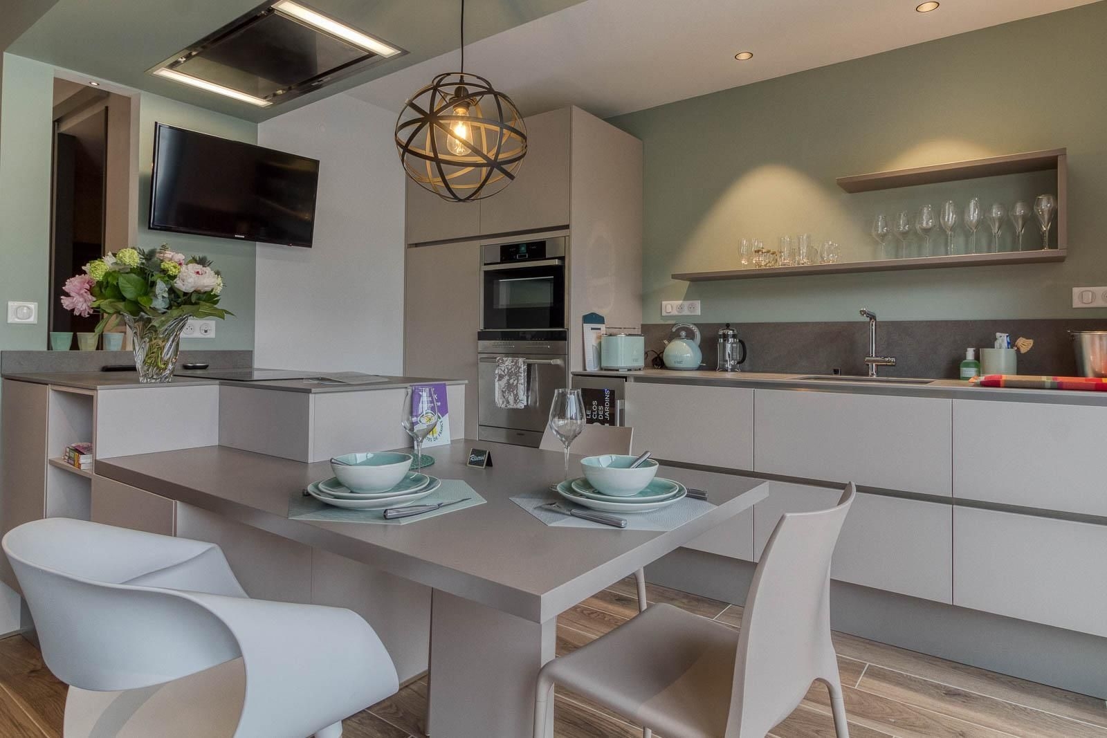 Rez-de-chaussée : grand séjour avec cuisine et espace repas intégrés, salon.