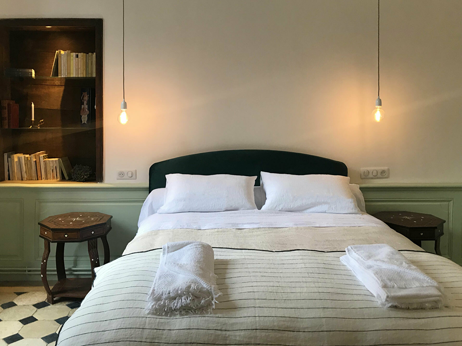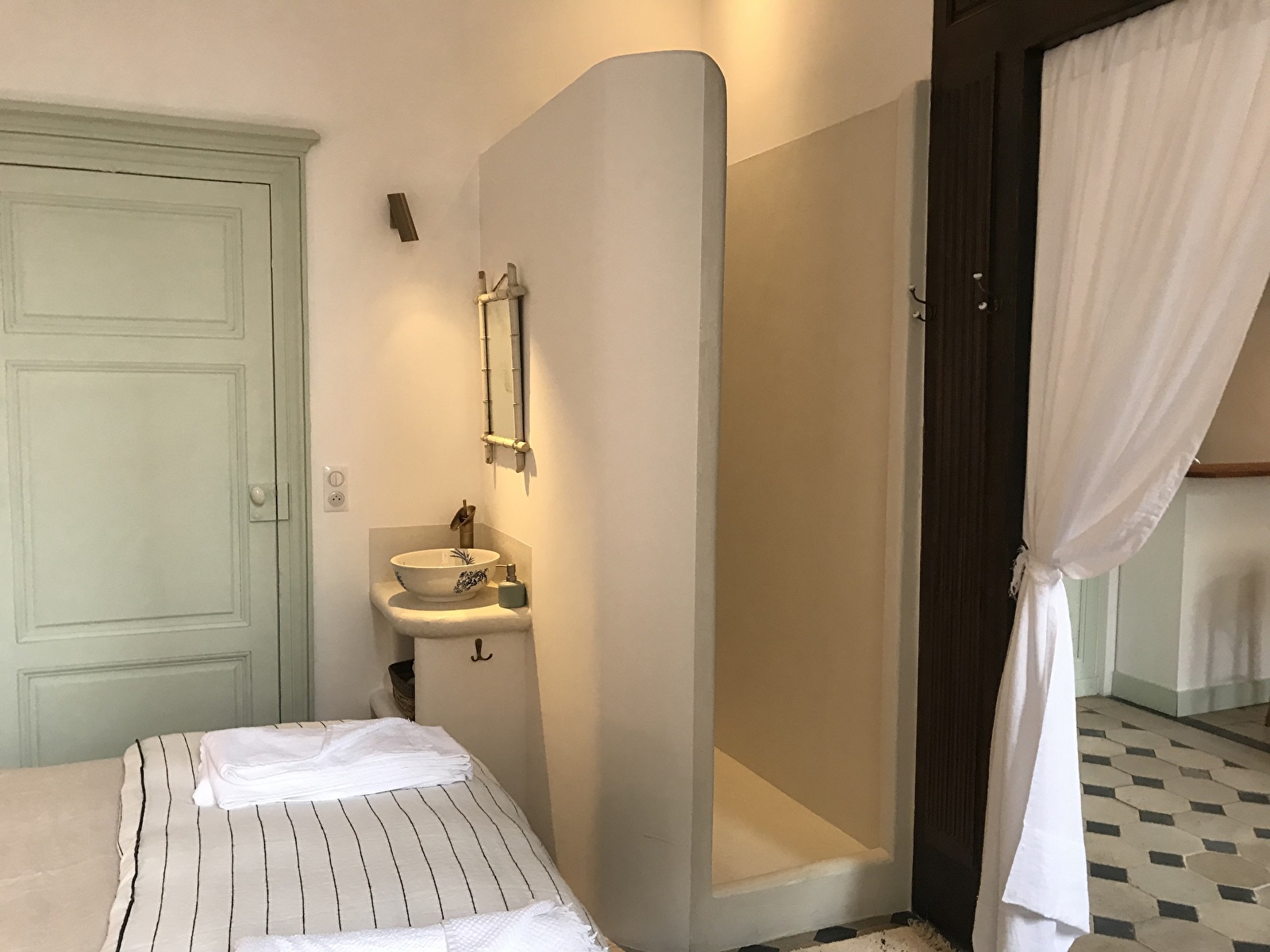 - 1 chambre avec un lit double ('queen size') ouvert sur une salle de bain avec douche à l’italienne.