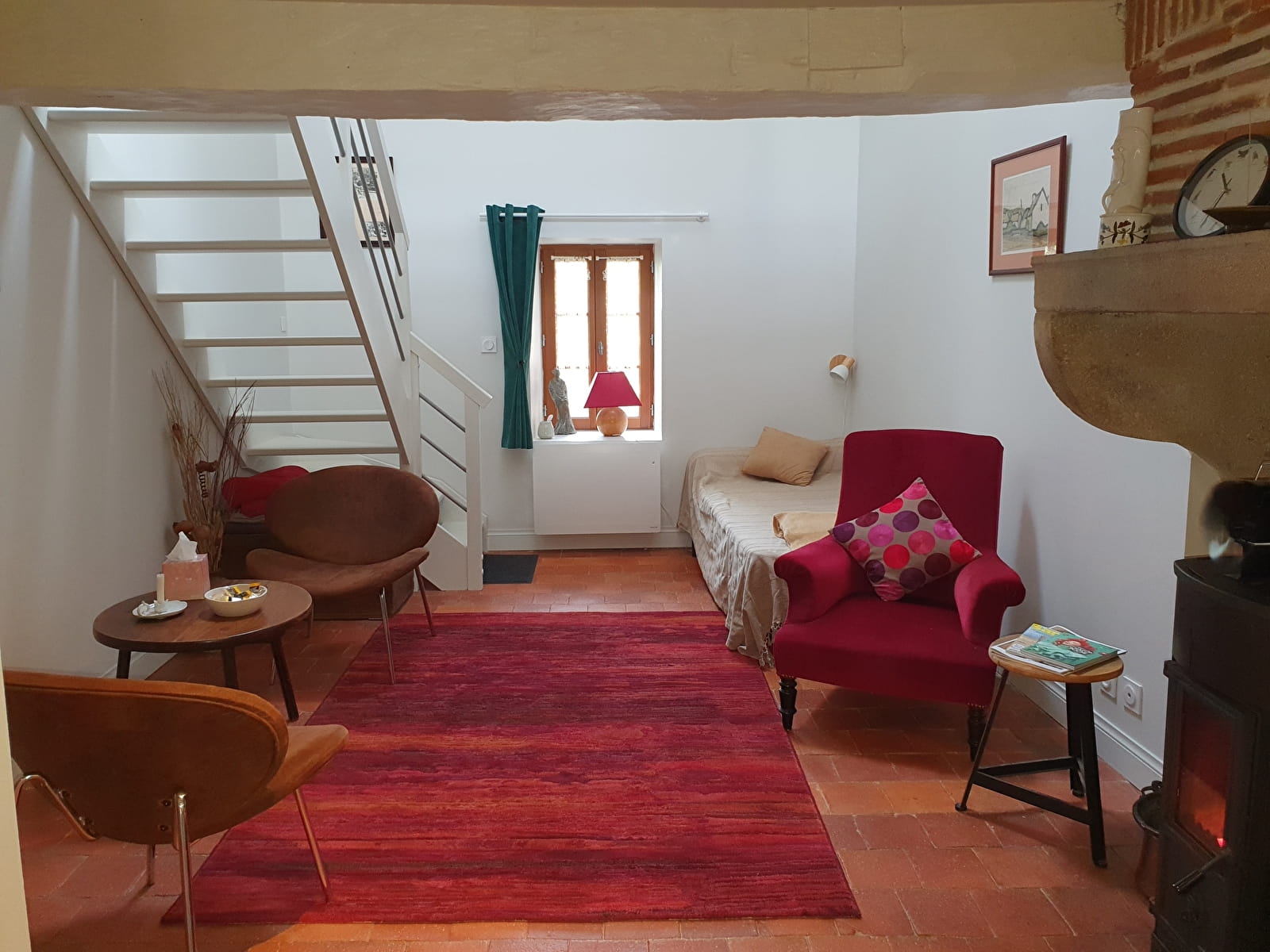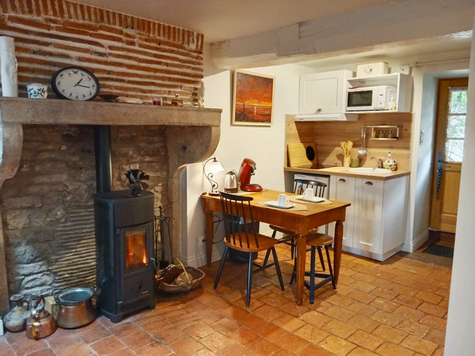 La pièce principale avec sa tommette ancienne, comprend une cuisine équipée, un espace repas, un coin salon devant le poêle à bois, un lit de 90.