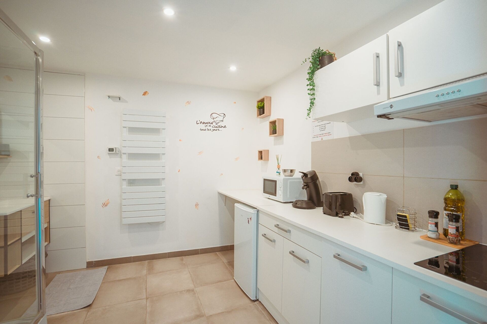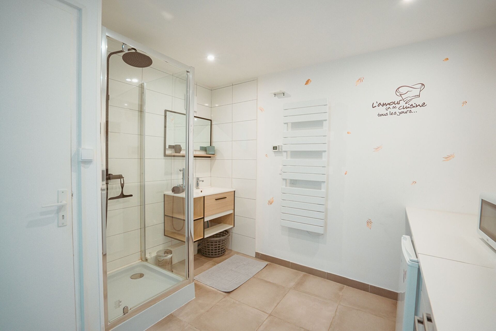 Le studio est composé également d'une pièce atypique, comprenant un coin cuisine équipé, une grande cabine de douche, un espace lavabo avec son meuble miroir, un sèche-serviette et un WC indépendant.