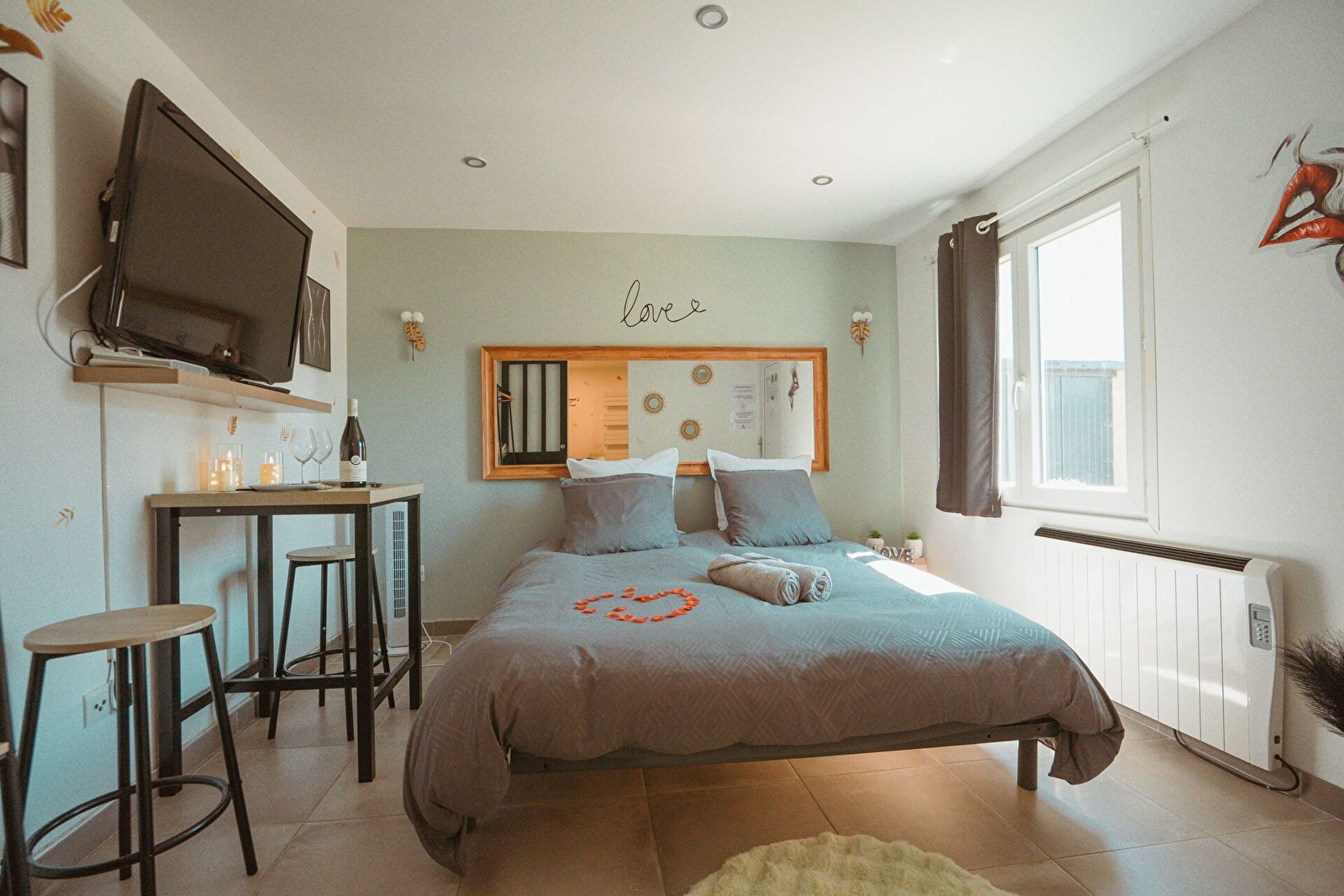 Vous découvrirez en rentrant dans le logement, une pièce de vie lumineuse, toute en sensualité avec son lit double au centre avec chevet.